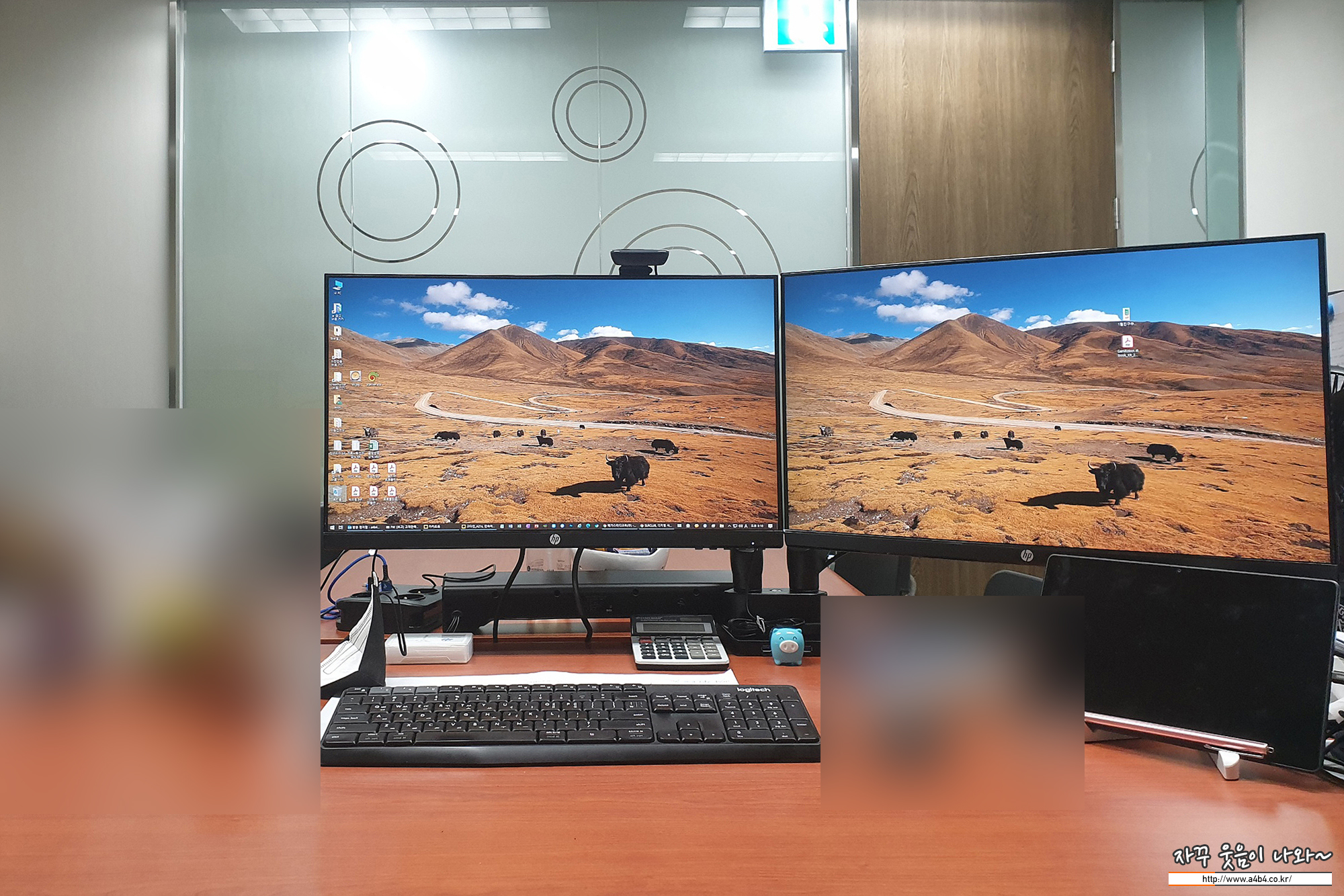 이렇게 회사에서는 루나랩 듀얼 모니터암 거치대를 이용하여 두 개의 모니터를 세팅합니다.