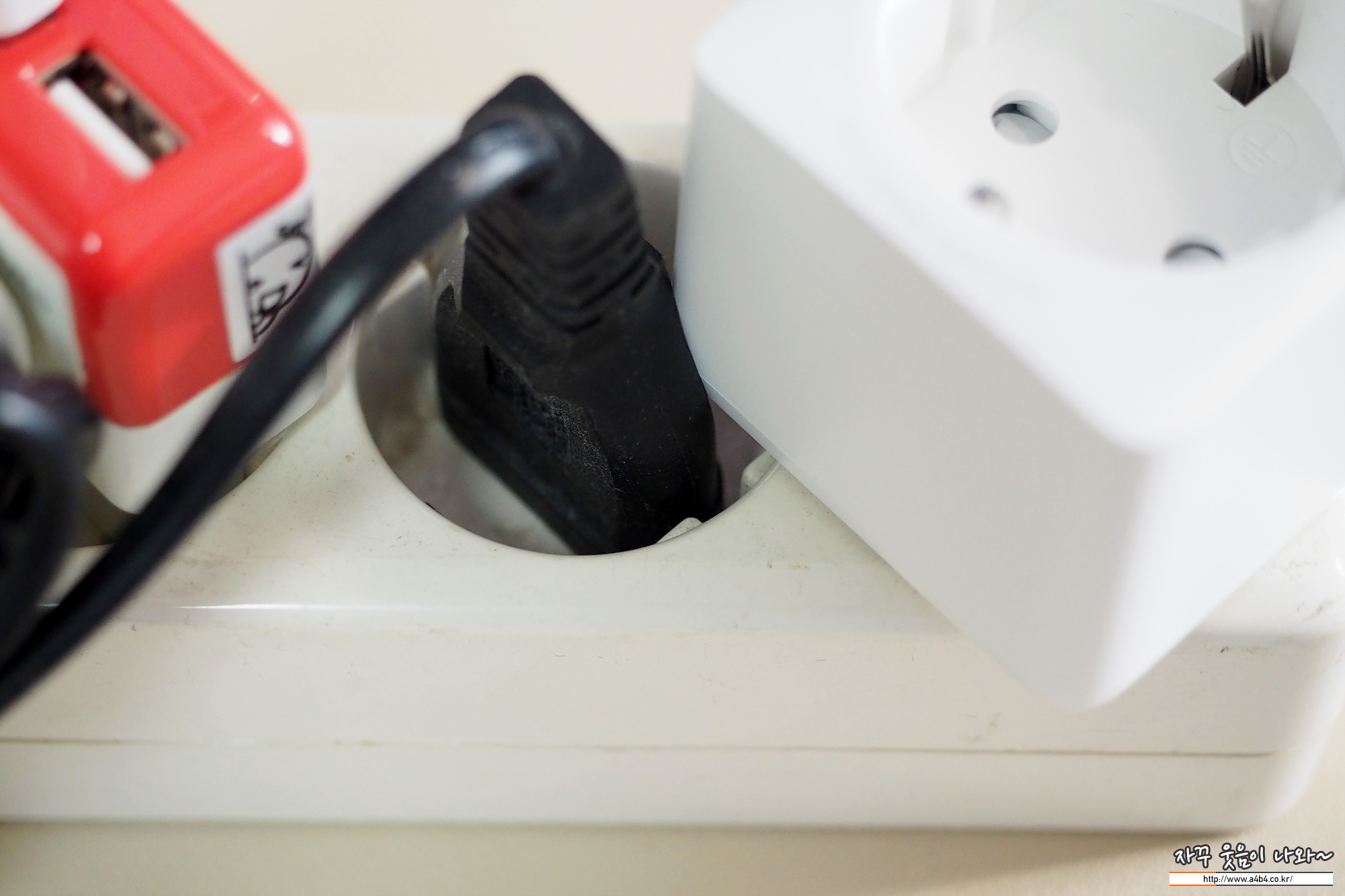 멀티탭 기준으로 요렇게 생긴 얇은 타입의 무접지 플러그는 사용이 가능하지만, 접지형 플러그나 스마트폰 충전기는 바로 옆에 사용은 어렵습니다.