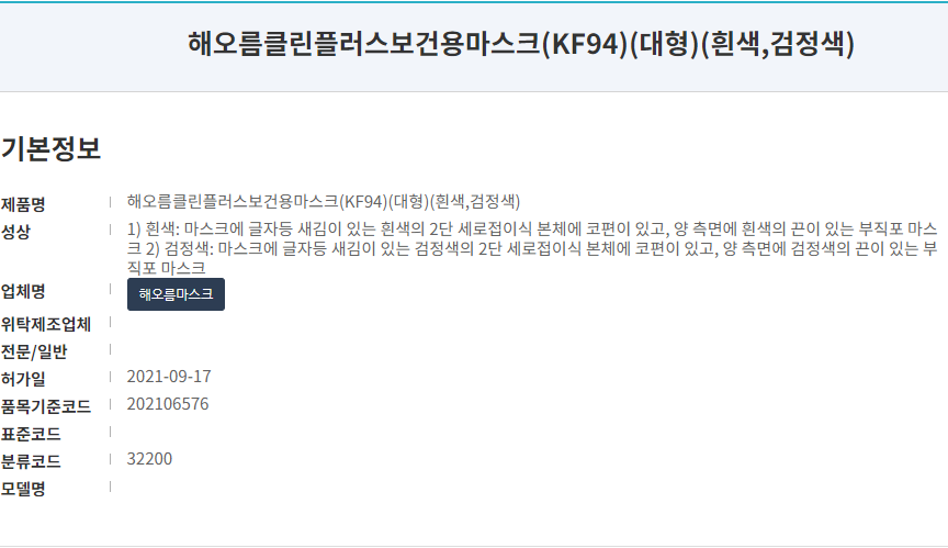 식품의약품안전처에 등록된 제품명칭은 '해오름 클린플러스 보건용마스크 (KF94)'입니다. 크기는 대형, 색상은 블랙과 화이트가 등록되어 있습니다. 작년 21년 9월 허가된 제품으로 마스크 제조사는 '주식회사 해오름'입니다. 기존 덴탈마스크로 잘 알려진 브랜드입니다.