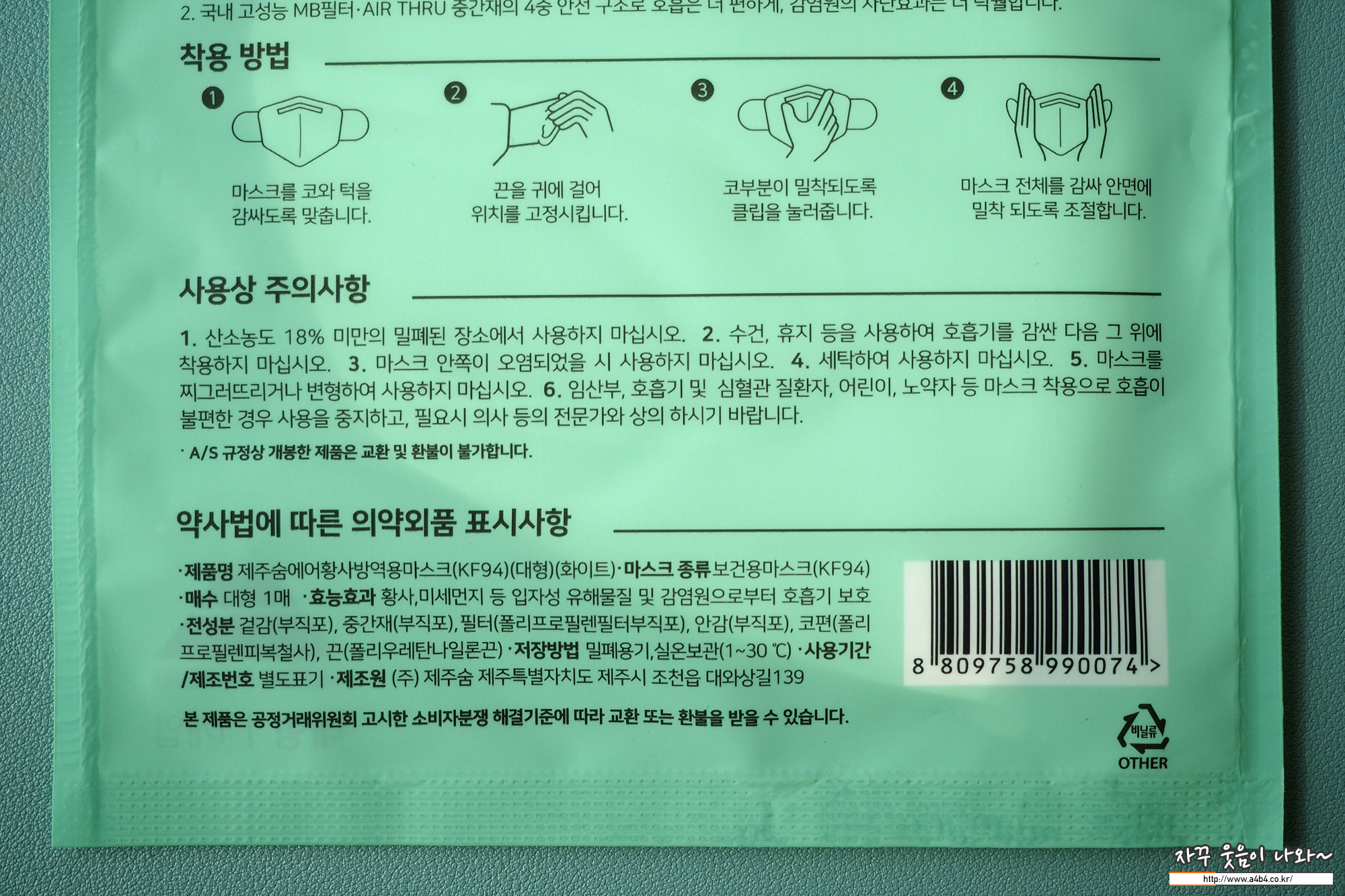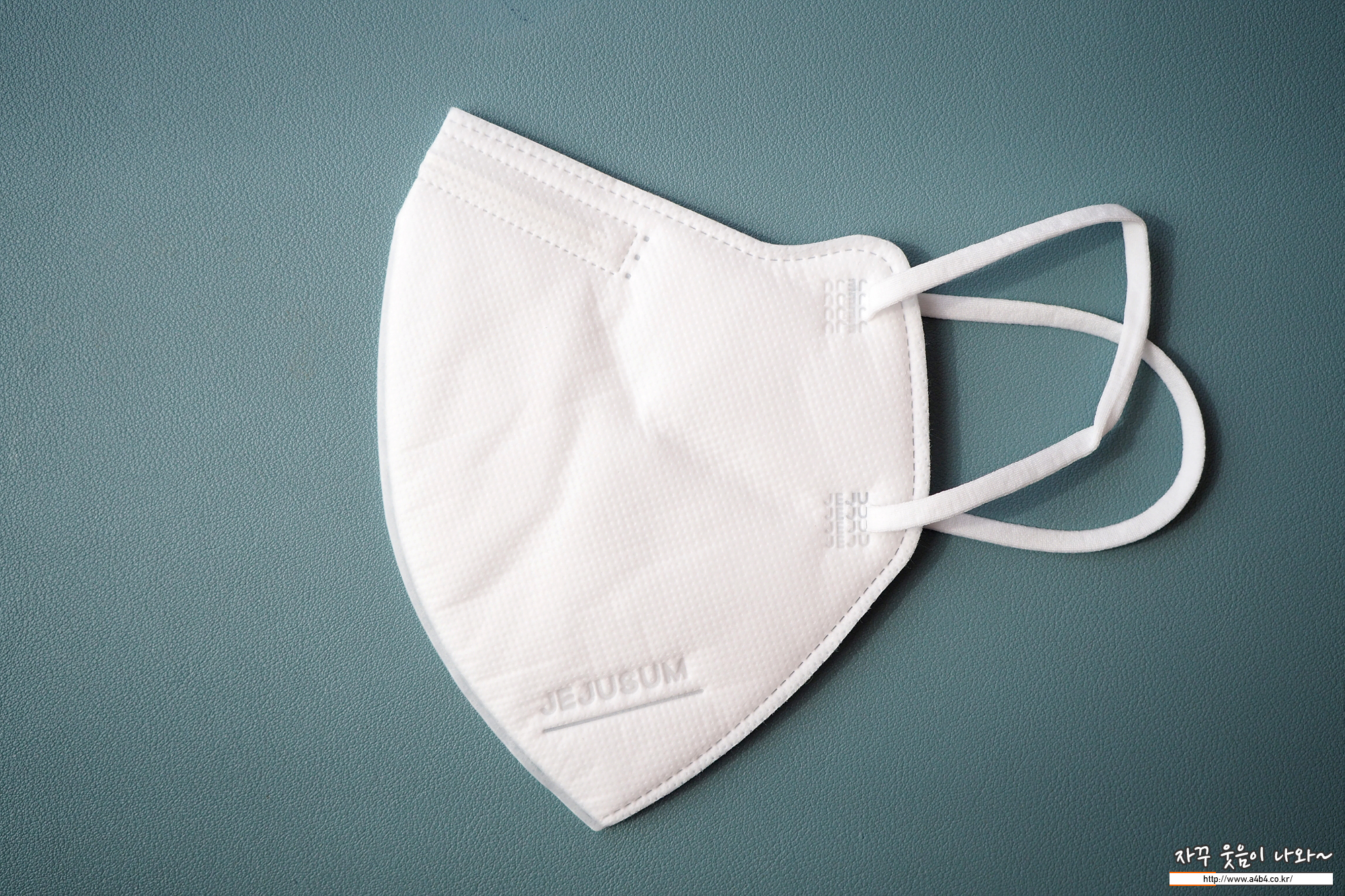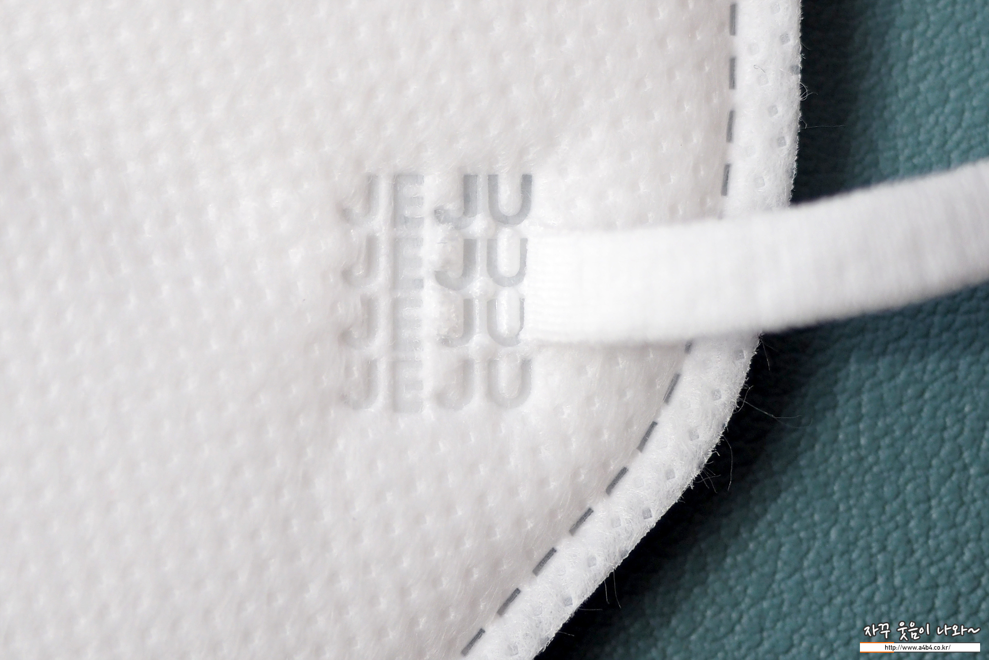마스크 착용감 또한 두께감이 느껴지는 약간 소프트한 착용감을 보입니다. 또한 제주숨 마스크에 사용된 원자재와 부자재는 100% 국내산이 사용되었다고 합니다.