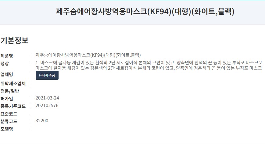 식품의약품안전처에 등록된 제품명은 '제주숨에어 황사방역용마스크 (Kf94)'입니다. 크기는 대형, 색상은 흰색과 검정색이 등록되어 있습니다. 작년 21년 3월 승인된 마스크로 제조원은 주식회사 제주숨입니다. 정말로 제주도에 위치한.