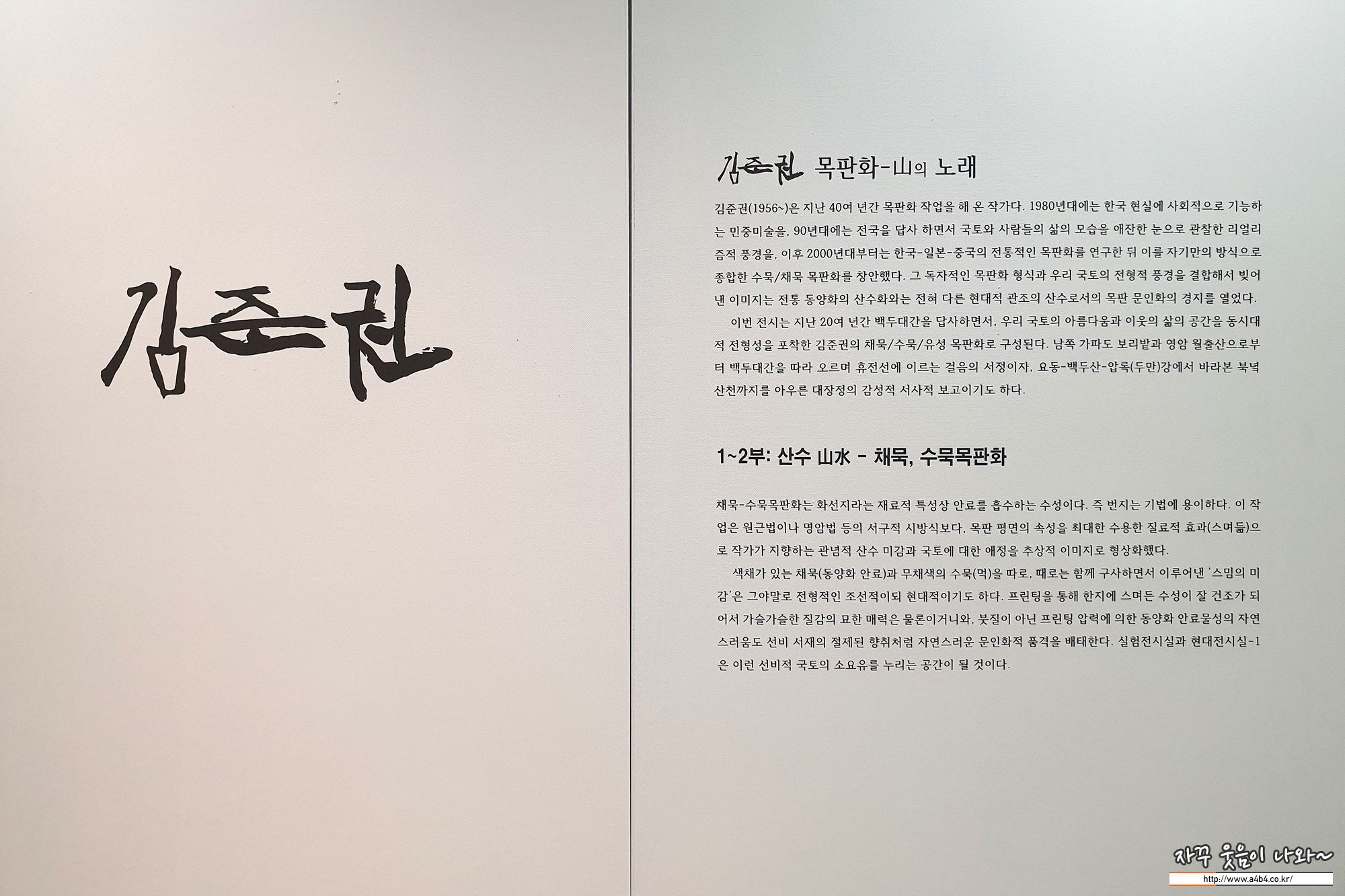 이번 전시회는 예술의전당 서예박물관 2층에서 열리고 있습니다. 총 3부로 나누어져 있으며, 1부와 2부는 채묵목판과 수묵목판화로 같은 공간에서 전시됩니다. 3부는 유성목판화로 또 다른 작품세계를 만나볼 수 있습니다.