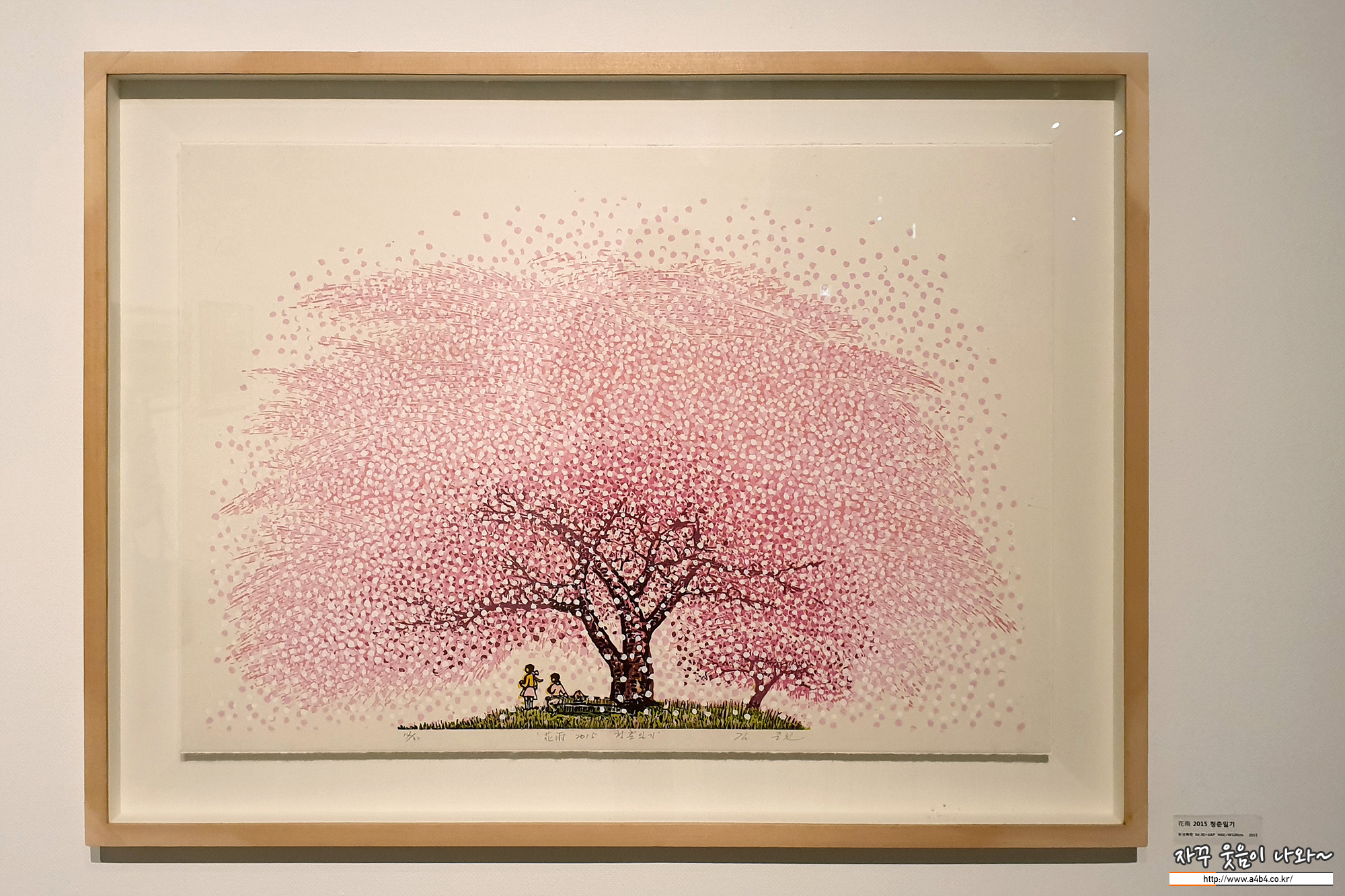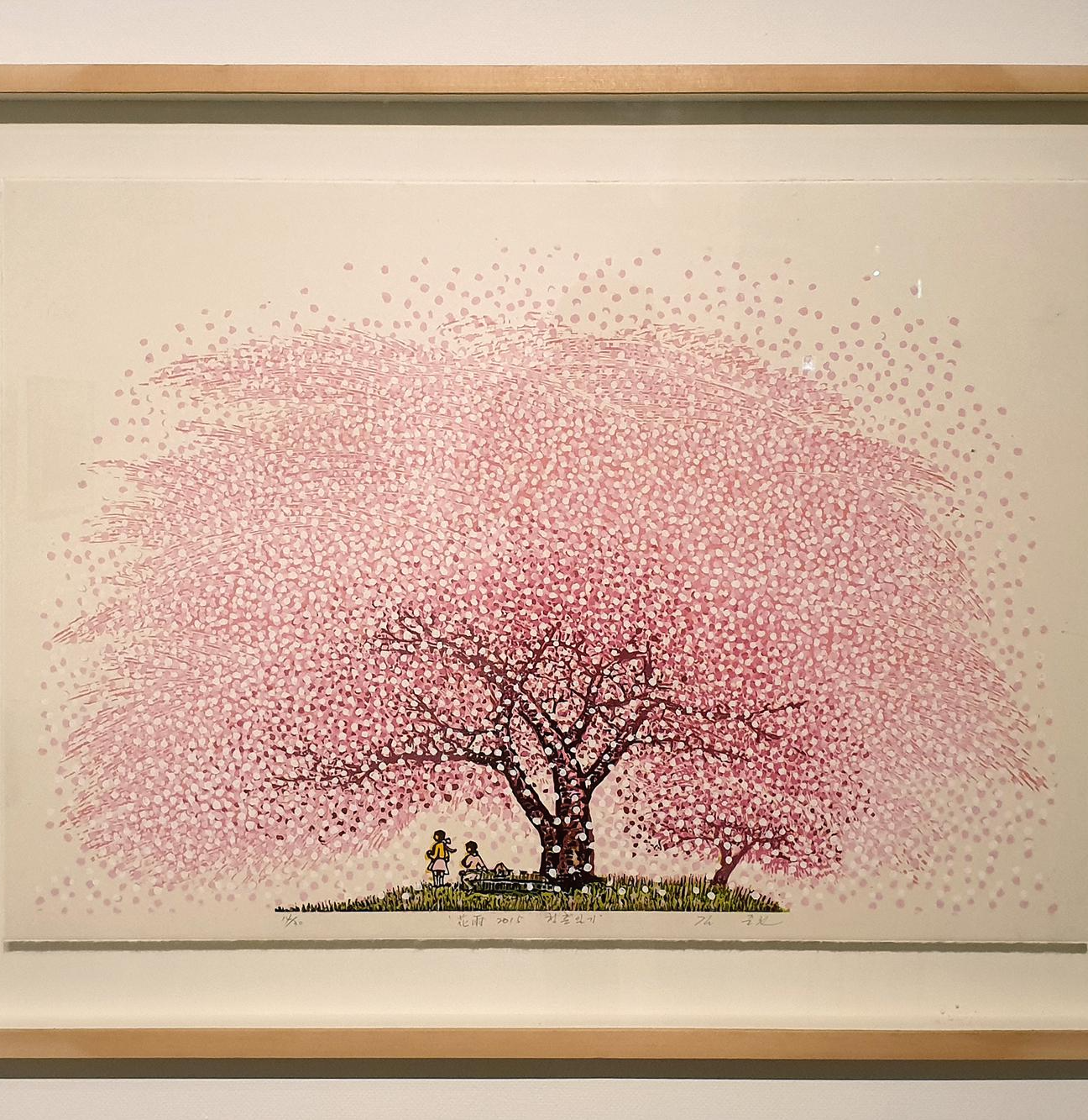 앞에서 본 작품들과는 조금 다른 느낌을 주는 유성목판 작품인 '꽃비' 연작들...