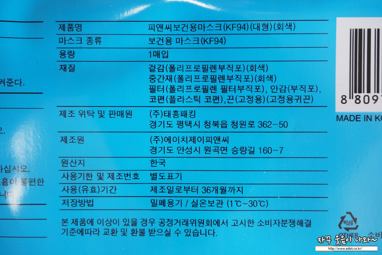 식약처 등록 제품명칭은 '피앤씨보건용마스크'입니다. KF94 보건용마스크로 마스크 색상은 여섯가지 다양한 컬러로 출시되어 있습니다. 21년 5월 허가된 마스크로 판매는 '태흥패킹' 제조사는 '주식회사 에이치제이피앤씨'입니다.
