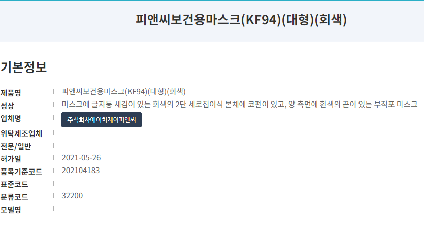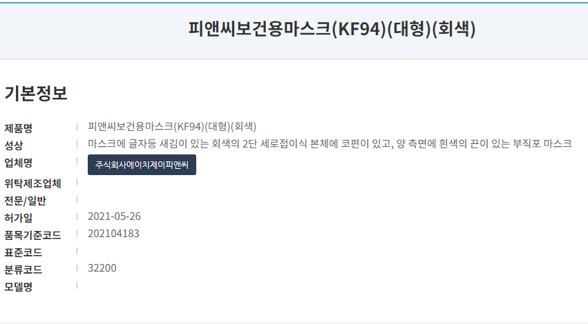 식품의약품안전처 의약품통합정보시스템 의약품제품정보 상세보기(피앤씨보건용마스크(KF94)(대