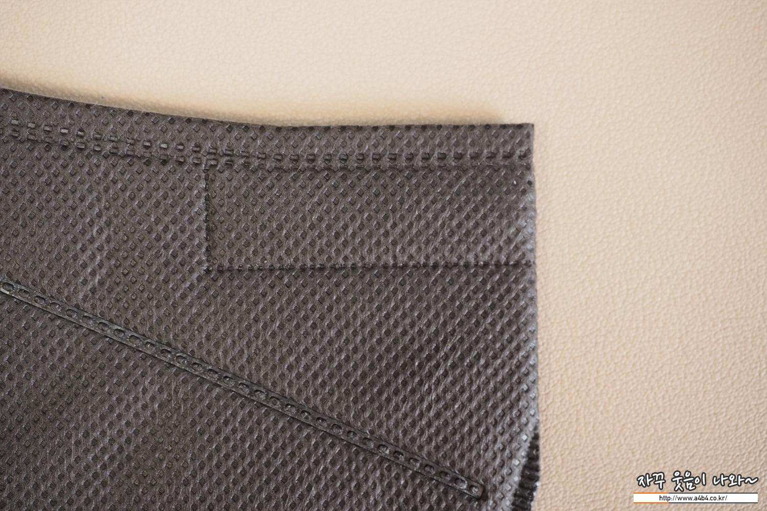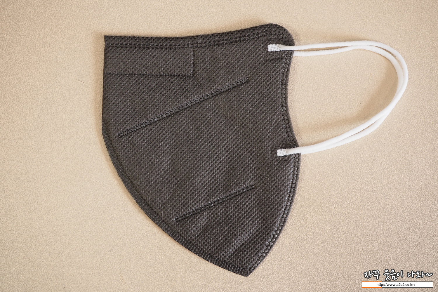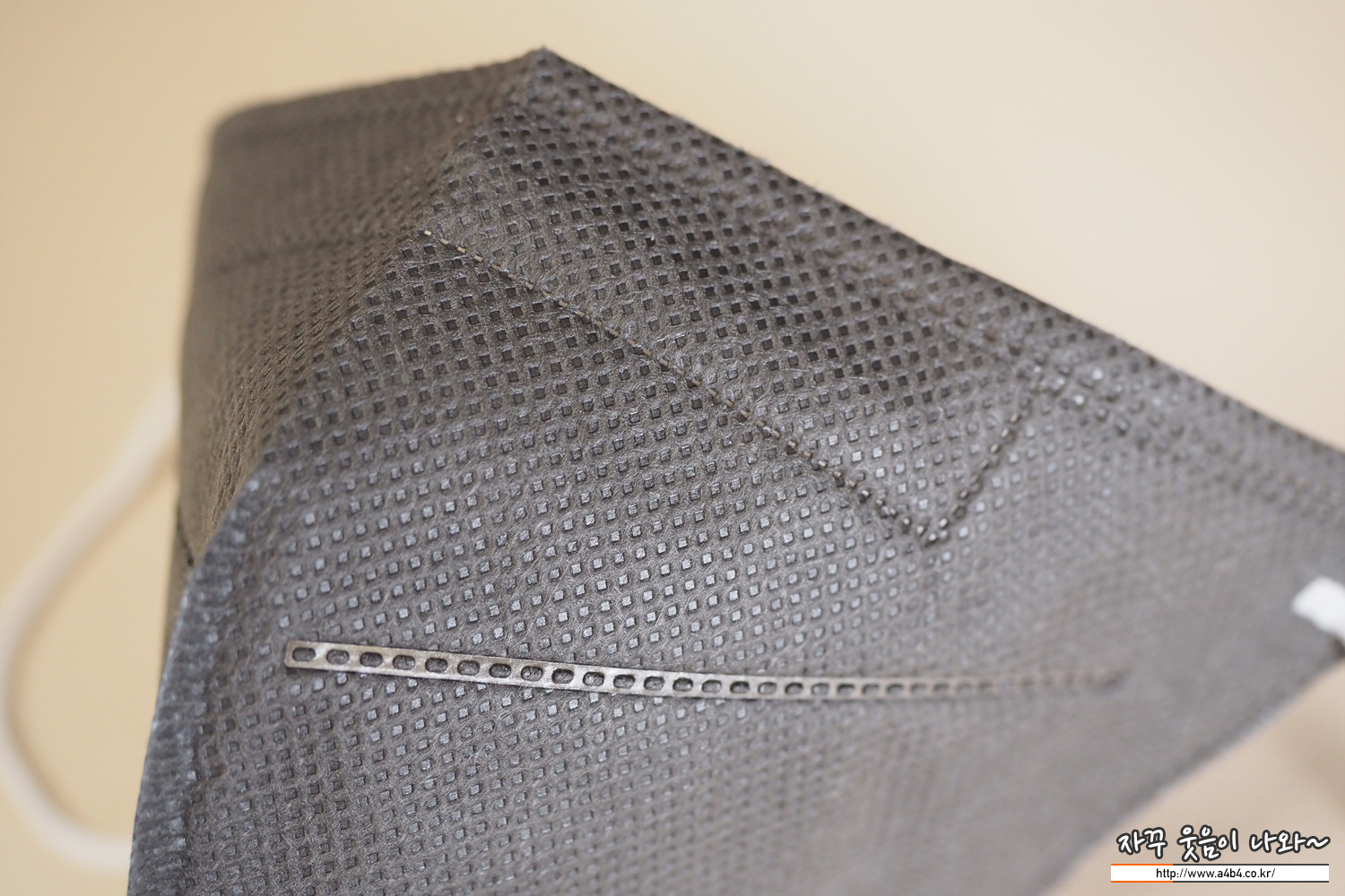 247 컬러 마스크 겉감은 도트 처리된 반유광 그레이 컬러 발색을 보입니다. 회색 컬러마스크 중에서는 다소 진한 색상을 보여주면 약간 유광 발색을 보이는 타입입니다. 마스크 염색상태는 얼룩 없이 깔끔하게 잘 처리되어 있습니다.