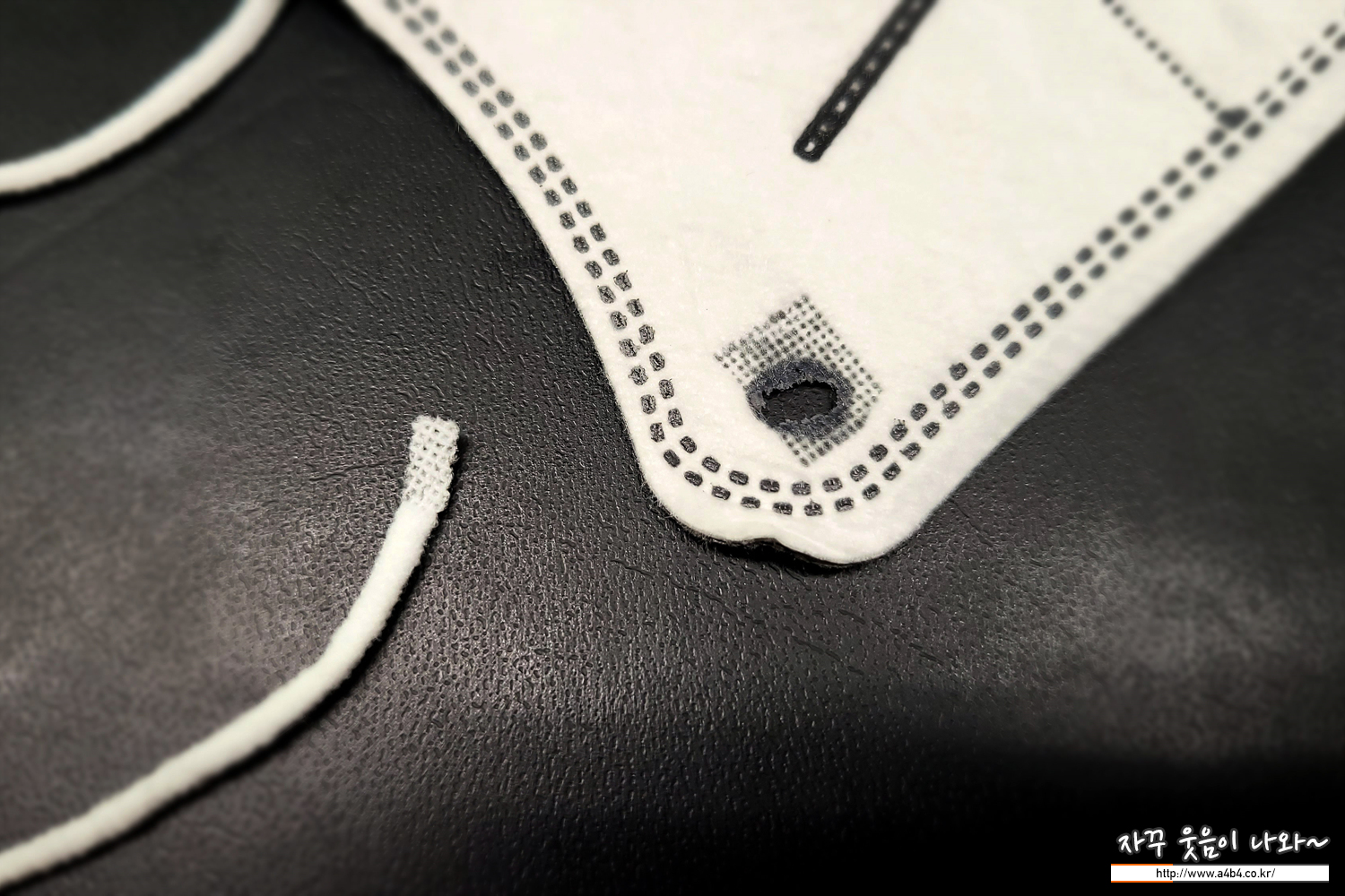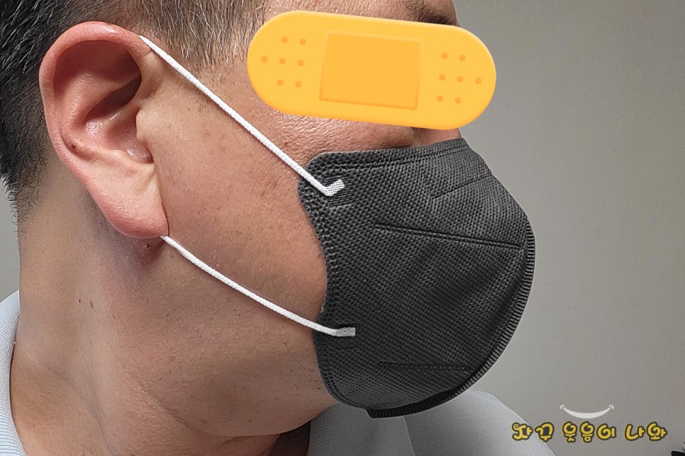 사진과 같이 원형의 구걸이끈이 살짝 접착된 마스크의 경우 귀걸이끈 접착력이 약한 경우가 많은데요. 이사칠 마스크 역시 반 나절도 사용하지 않고 끈이 톡 하고 떨어지네요. 동일제조사에서 만든 흰색 제품에서도 동일한 경험이 있었는데, 단순히 제가 운이 나쁜것이 아니라 구조족안 문제같다는 저의 주관적인 생각입니다.