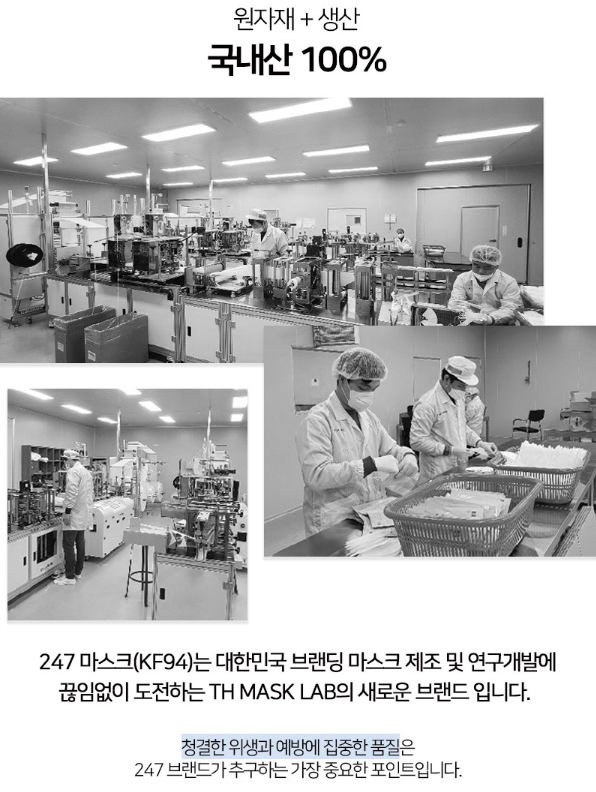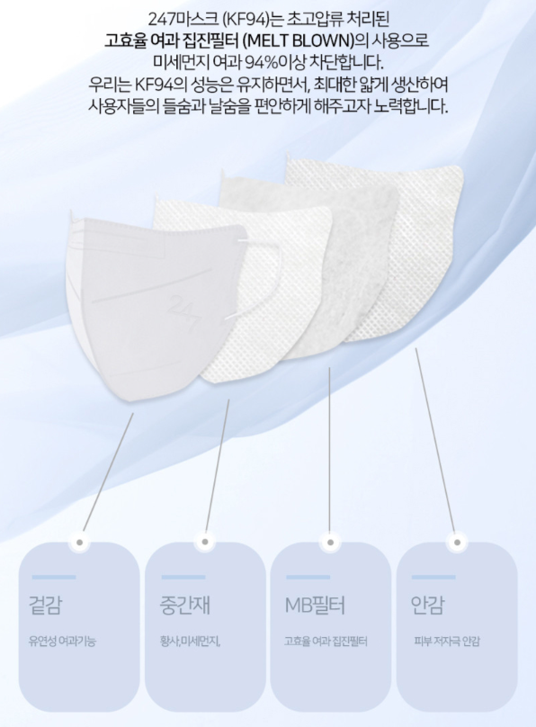 247 컬러 마스크 장점은 100% 국내산 원자재와 부자재를 사용한 것으로 안내되어 있습니다. 마스크에서 약품 냄새는 없으며, 매끈한 촉감을 보이는 부직포가 안감으로 사용되었습니다.