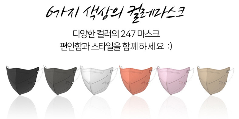 247 컬러 마스크는 가로 2단접이 새부리타입의 보건용마스크입니다. 다른 제조사에서도 많이 사용되는 평범한 디자인을 보여주며, 옆면 2개의 라인과 흰색 귀걸이끈이 특징인 제품입니다.