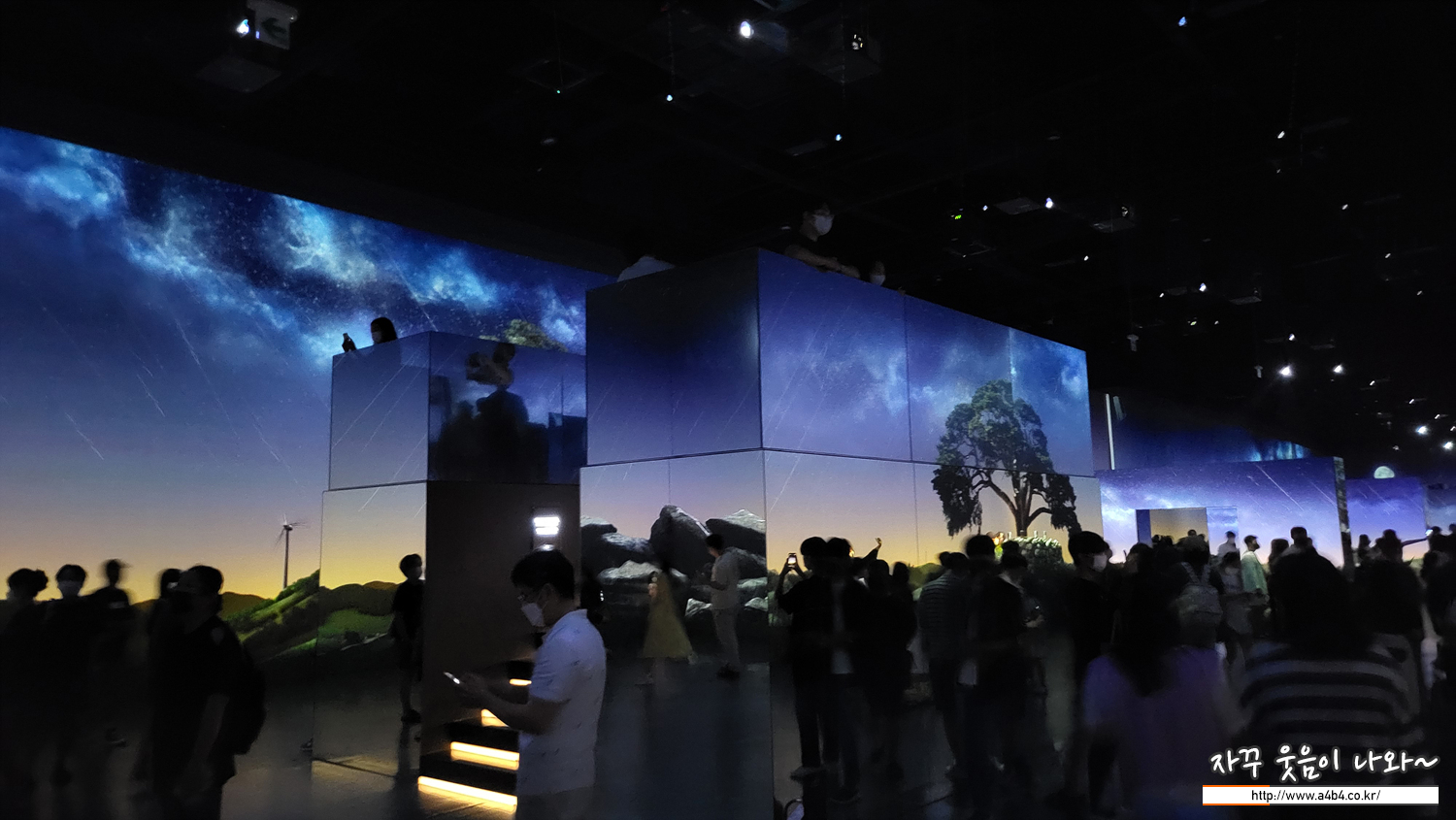 전시장은 이렇게 넓고 어두운 공간에 섹션별로 다양한 주제의 미디어아트가 전시되고 있다. 일부 전시공간은 2층으로 이동해야 하는데, 계단으로 구성되어 있어 일부 장애인은 이동이 어렵거나 다소 불편한 부분도 있다.