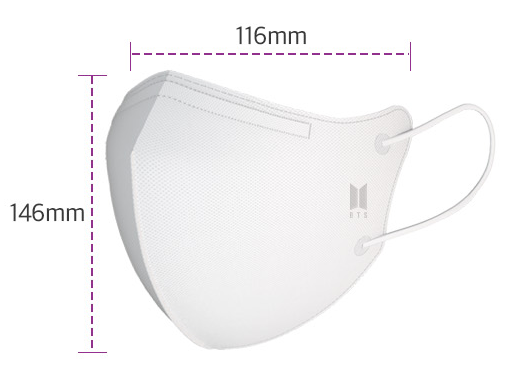 BTS 마스크 사이즈는 가로 폭 길이 116mm, 세로 높이 146mm로 일반적인 대형 새부리타입 마스크 사이즈입니다.