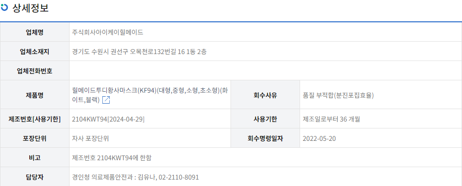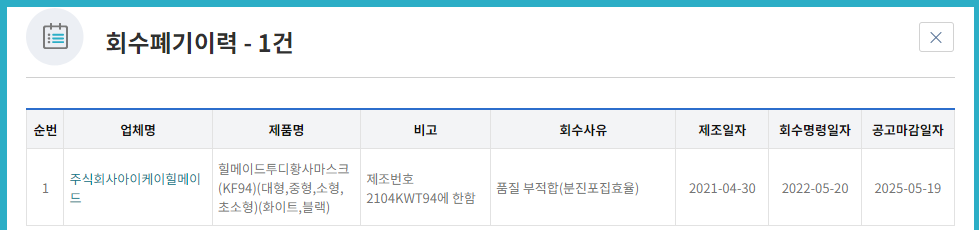해당 제품은 올해인 22년 5월 식약처 불량마스크로 등록되어 있습니다. 회수사유는 '품질부적합 (분집포집효율)'로 Kf94 마스크의 성능 기준을 충족하지 못하는 것으로 알고 있습니다.