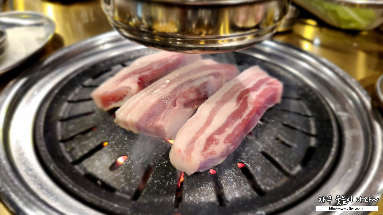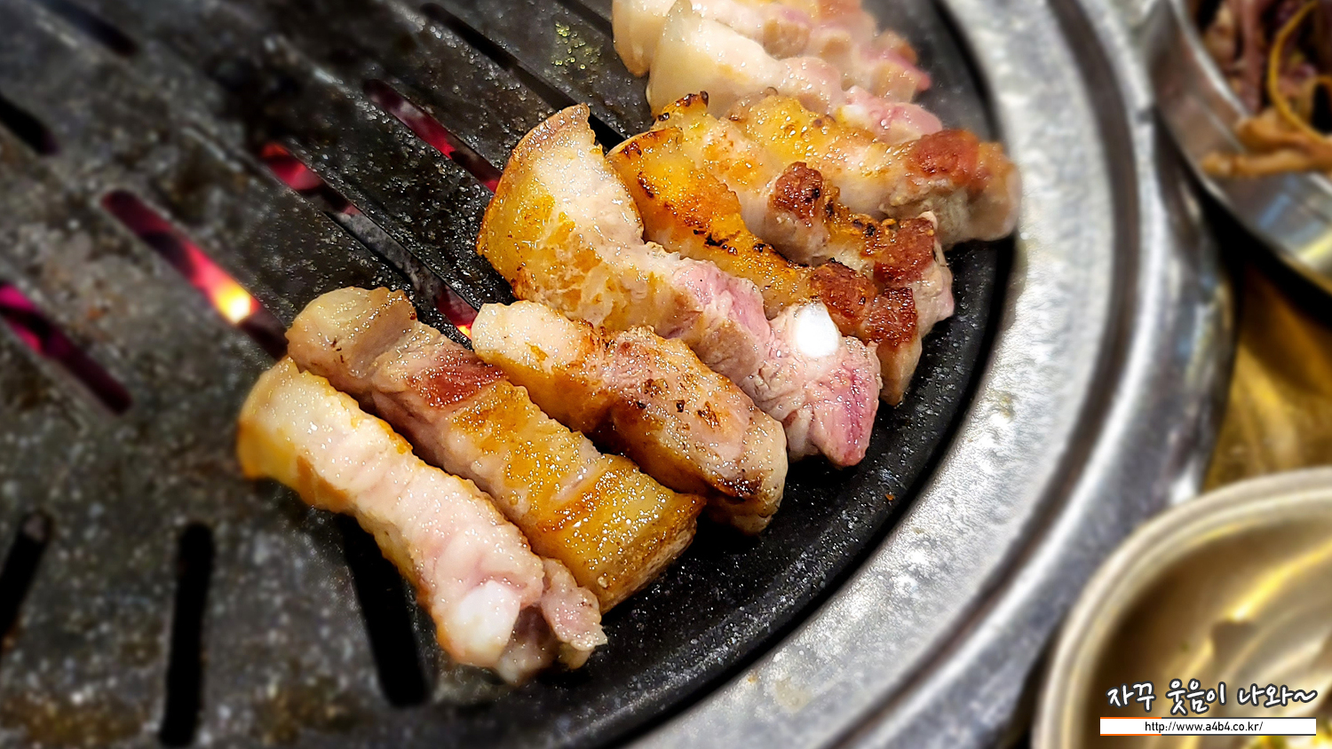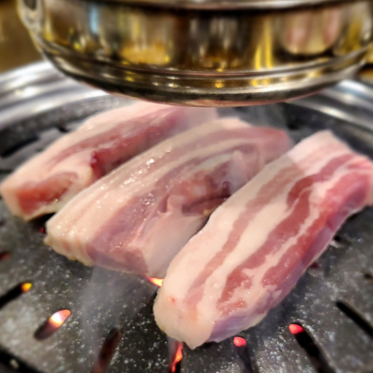 불판위에 흑돼지 오겹살을 올려놓고 있는데... 고기가 두껍다 보니 얇은 삼겹살 보다는 인고의 시간이 필요합니다.