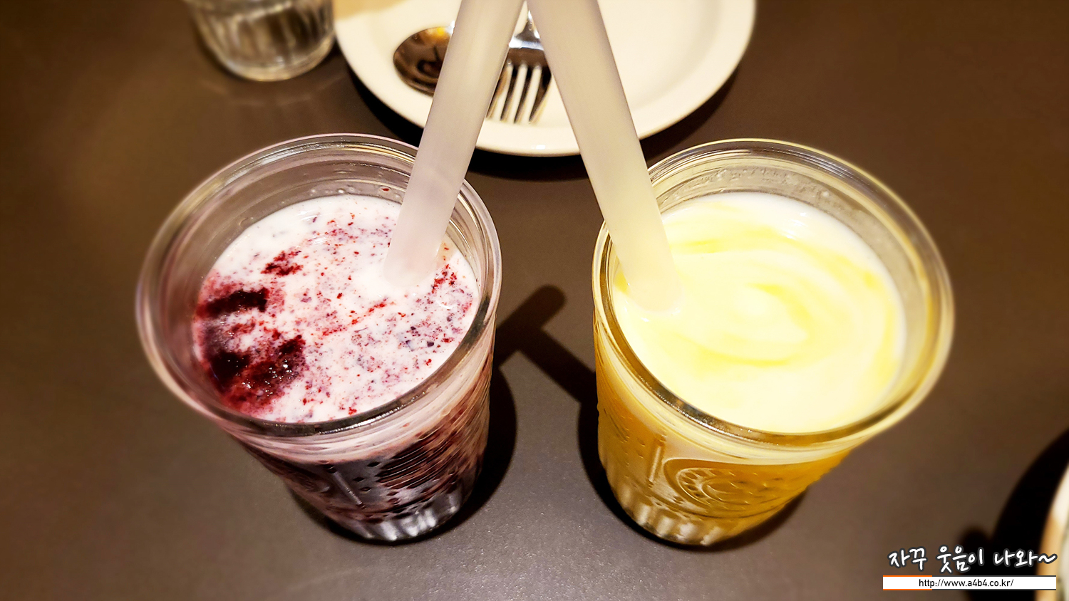 강가 세트메뉴에 포함된 라씨 두 잔, 블루베리와 망고 라씨를 주문합니다. 라씨만의 약간 시큼하면서 짠맛이 잘 느껴지네요.평소에는 전혀 먹지않는 음식인데, 인도요리 전문점에만 오면...