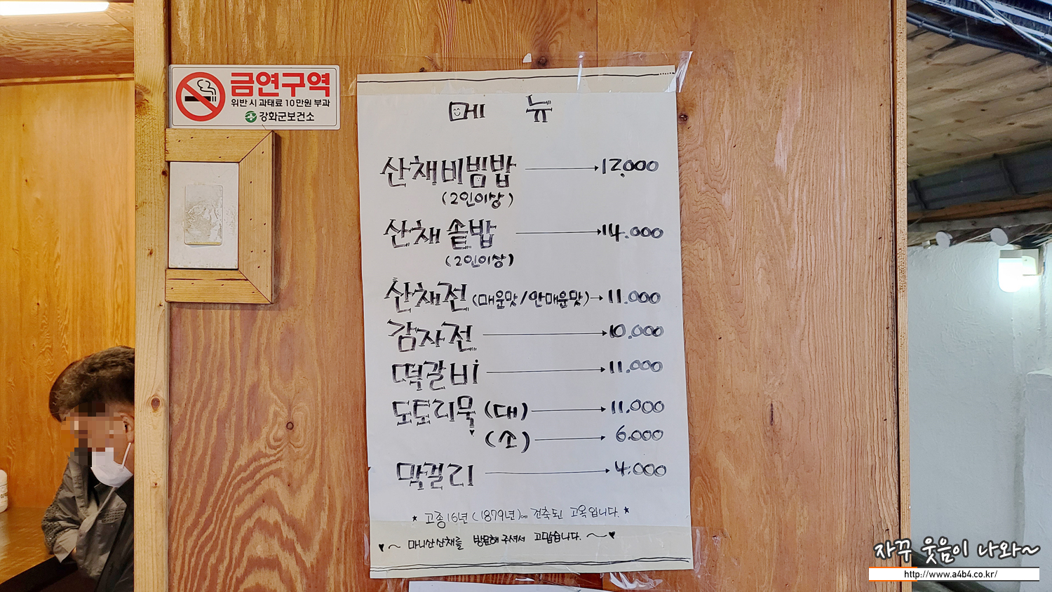 | 강화도 마니산 산채 비빔밥 메뉴 및 가격