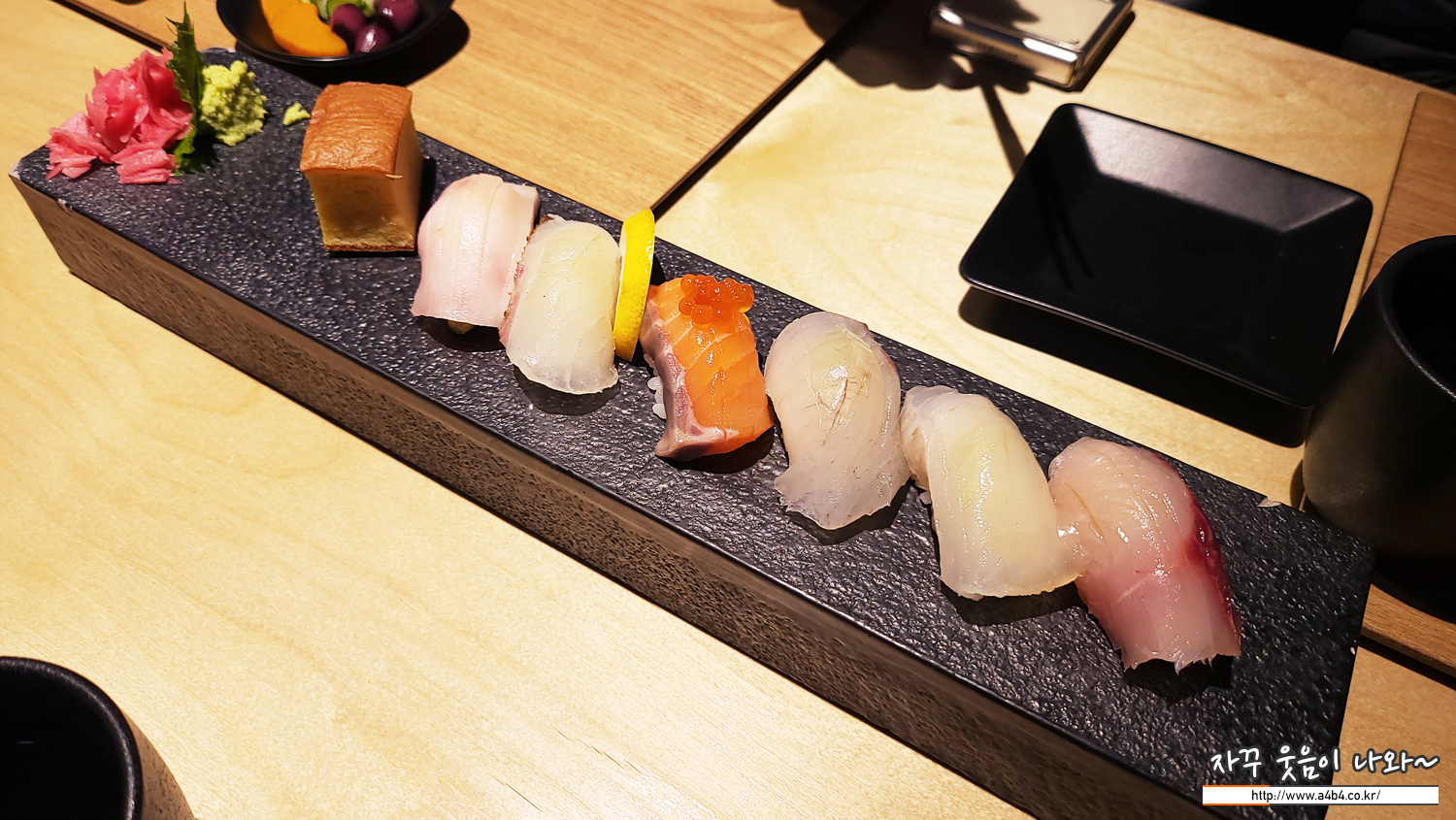 먼저 나온 코바치 초밥 절반은 쏘쏘한 녀석들입니다. 연어 광어 우럭? 등으로 보이는데요. 크게 독특한 초밥은 없습니다.
