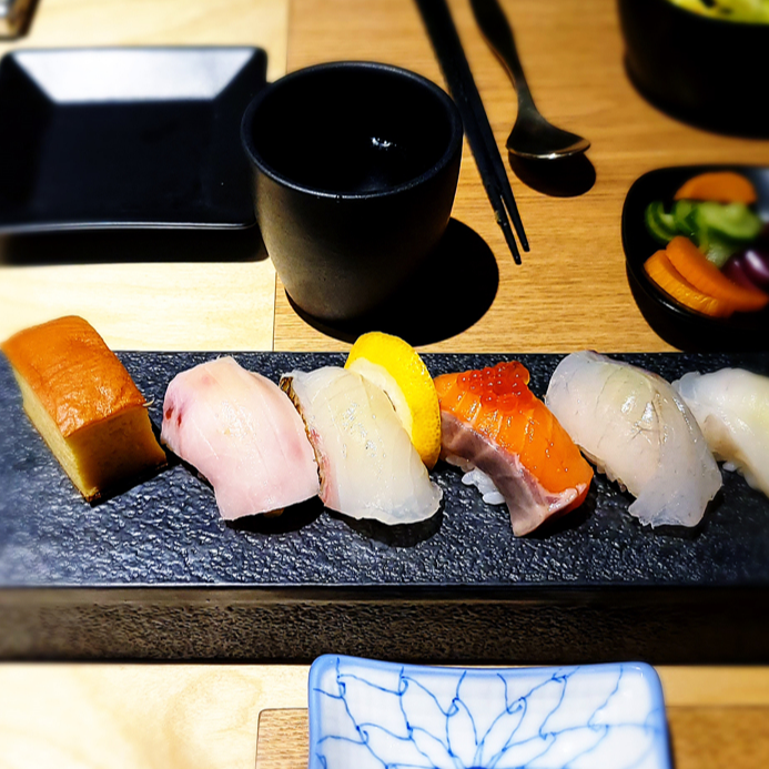 12개가 나오는 코바치 초밥입니다. 6개 씩 두 판이 나오는 구성인데요. 먼저 절반만 서빙되었습니다.