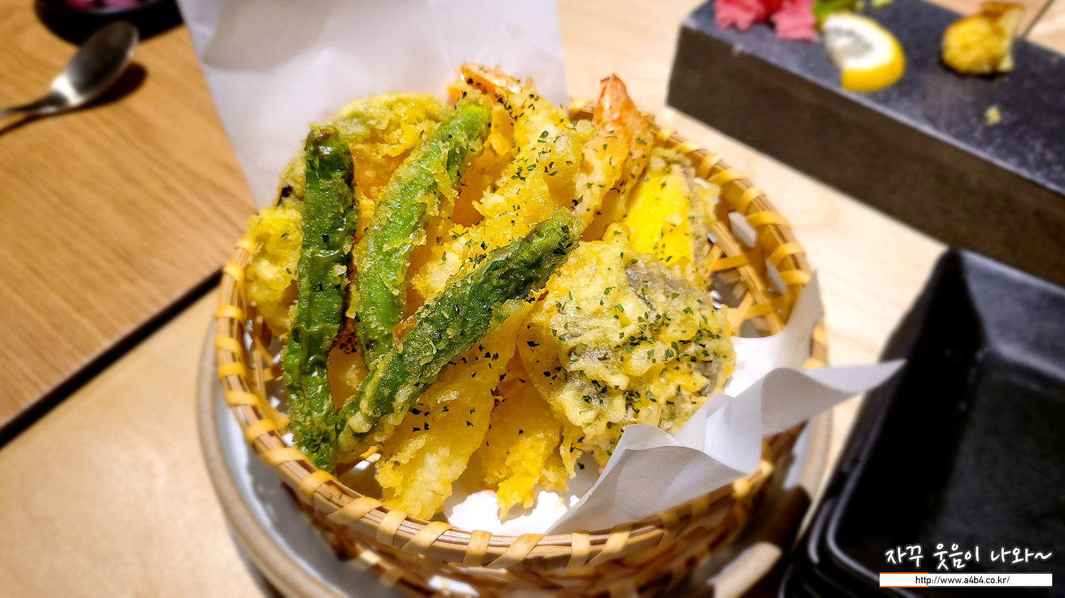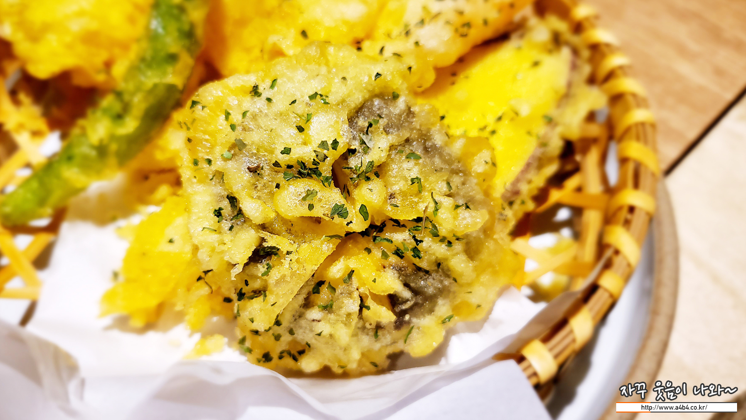 깔끔한 튀김입니다. 새우튀김, 표고버섯튀김, 고추튀김, 호박튀김 등이 3개 또는 1개씩 나오네요. 두세명이 식사와 함께 나눠 먹기에 좋은 양입니다. 코바치 튀김은 무난...