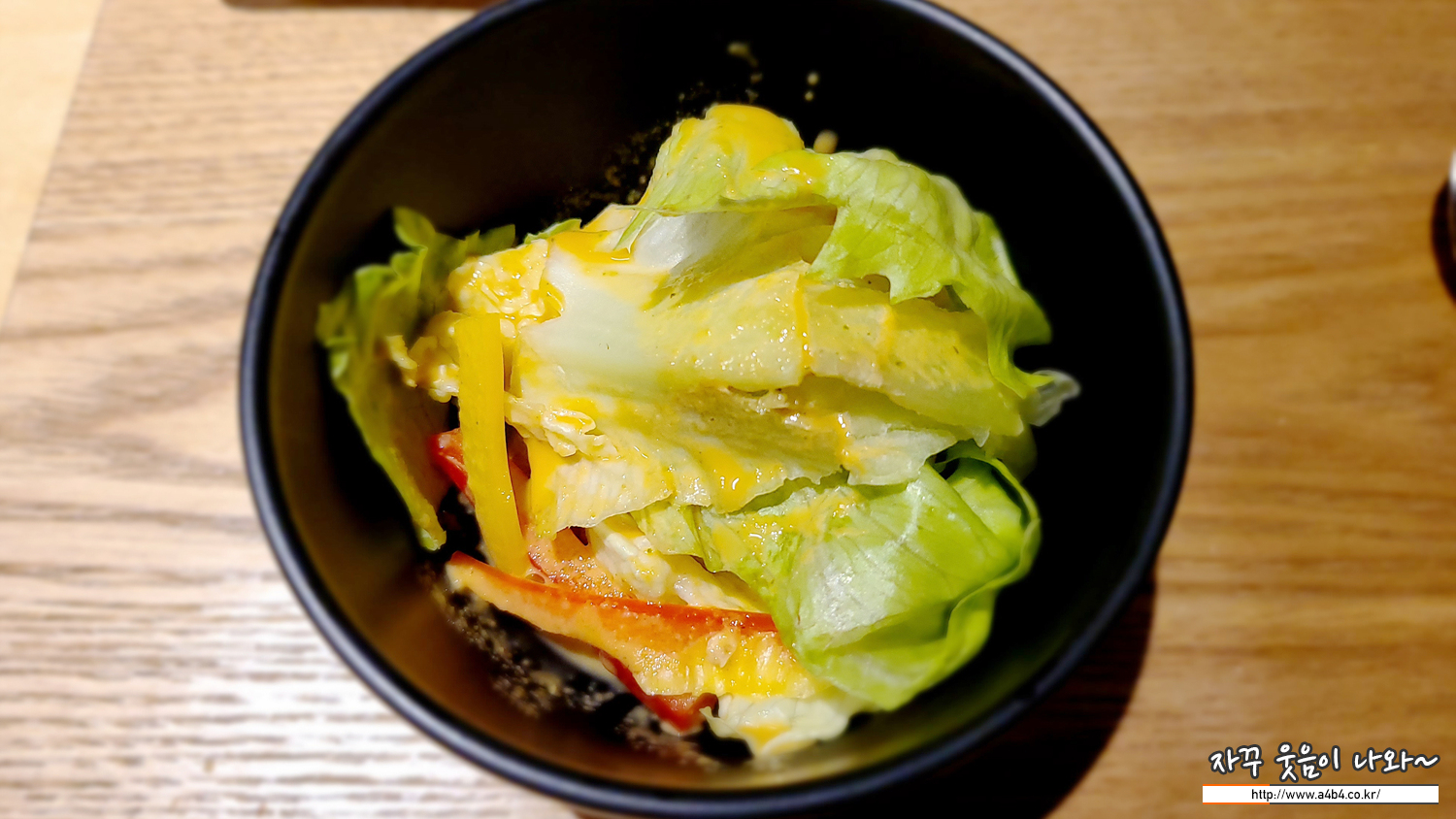 주문 후 샐러드가 나옵니다. 쏘쏘한 샐러드를 먹으면서 다음 식사를 기다립니다.