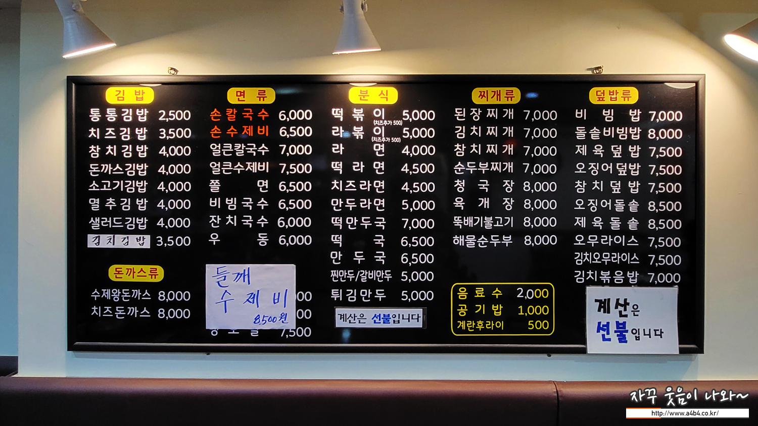 그러나 이곳 잠실김밥의 메인 메뉴는 메뉴판에 붉게 표시된 손칼국수와 손수제비가, 들깨수제비가 가장 유명합니다.