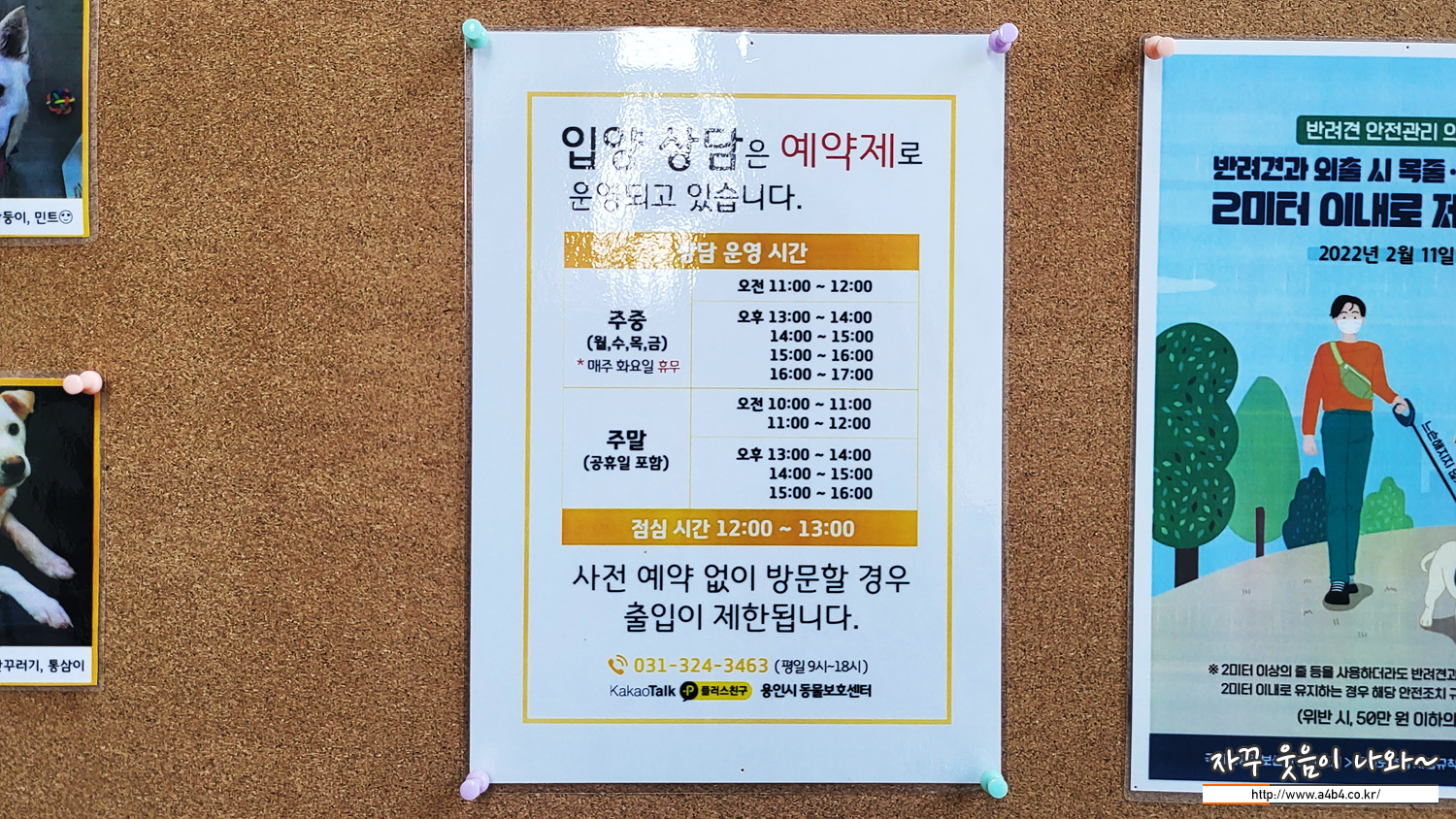 이곳 용인 유기견 보호센터 방문을 위해서는 사전 예약이 필요합니다. 온라인에서 먼저 유기견 공고를 보고 입양을 희망하는 유기견이나 유기묘를 전화로 상담받고 입양을 위한 방문시간을 예약해야 합니다.