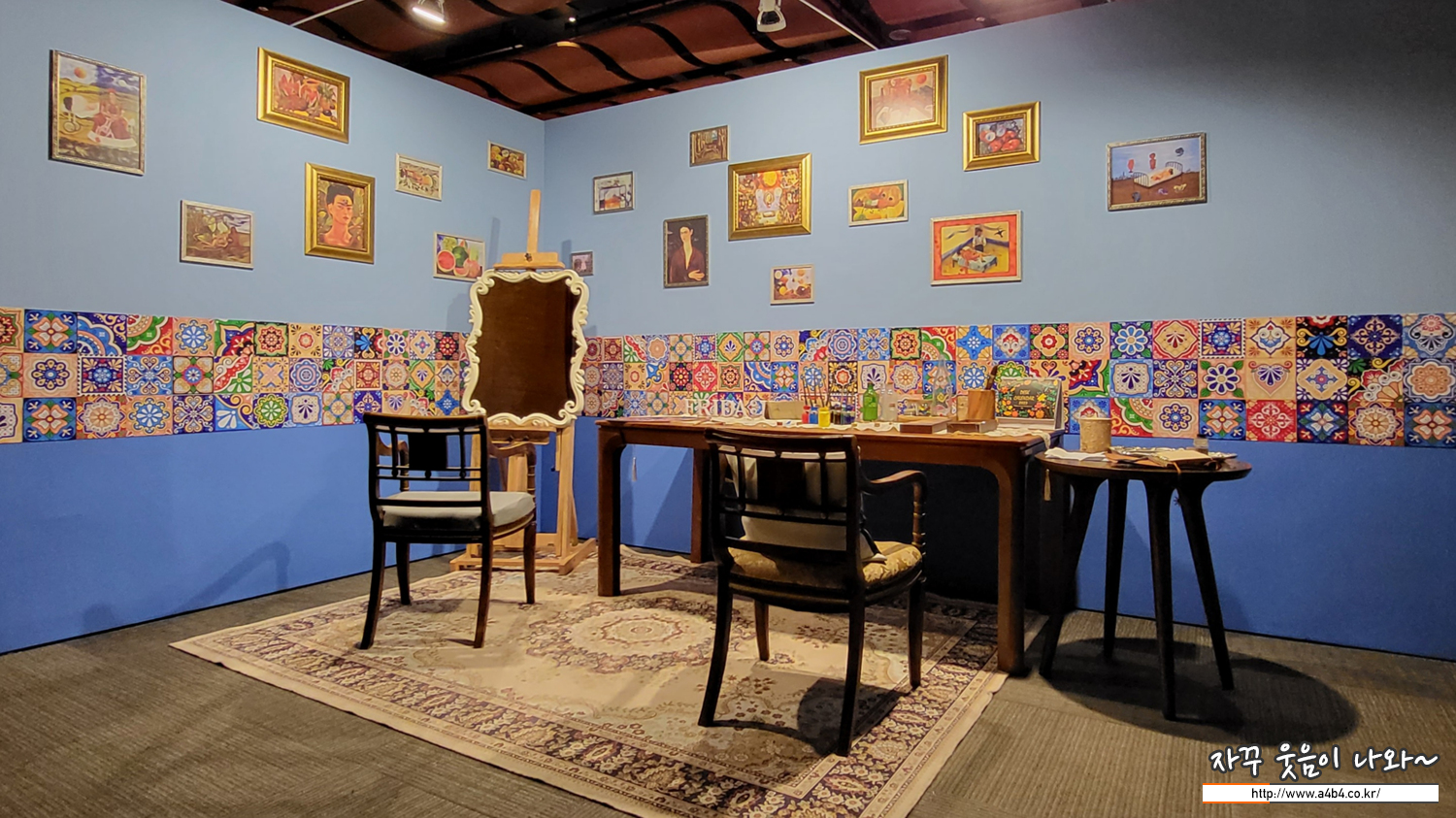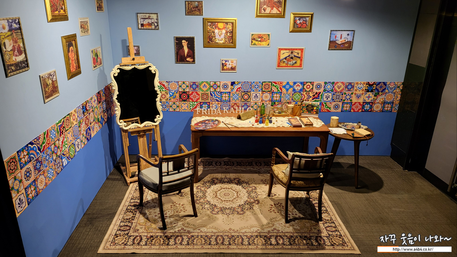프리다 칼로 전시회 마지막 공간은 그녀가 태어나고 삶을 마친 푸른집의 프리다 칼로 작업실을 모티브로 구성했다고 합니다. 맥시코의 이국적인 패턴과 그녀의 작품 속에서 기념사진 한 장 남길 수 있는 공간입니다.