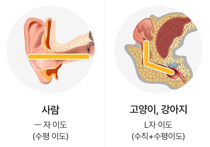 아래와 같이 강아지 귓구멍은 사람과 다르게 L자 구조로 되어 있다고 합니다. 그래서 이물지 배출과 통풍이 어려워 귀 질환에 걸리기 쉽다고 하네요. 그래서 지속적인 귀 관리가 필요하다 합니다.