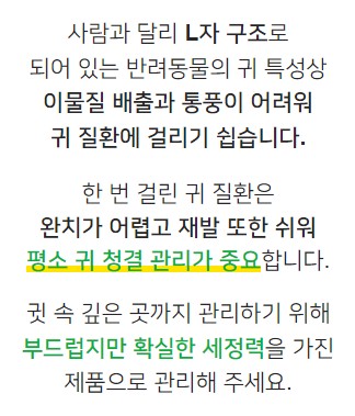 반려동물이 스스로 귀를 털게해 주시고 솜으로 부드럽게 닦아주세요. 특히 귀를 털면 아로마향의 액체가 사방으로 튀기게 되니 주의하세요.