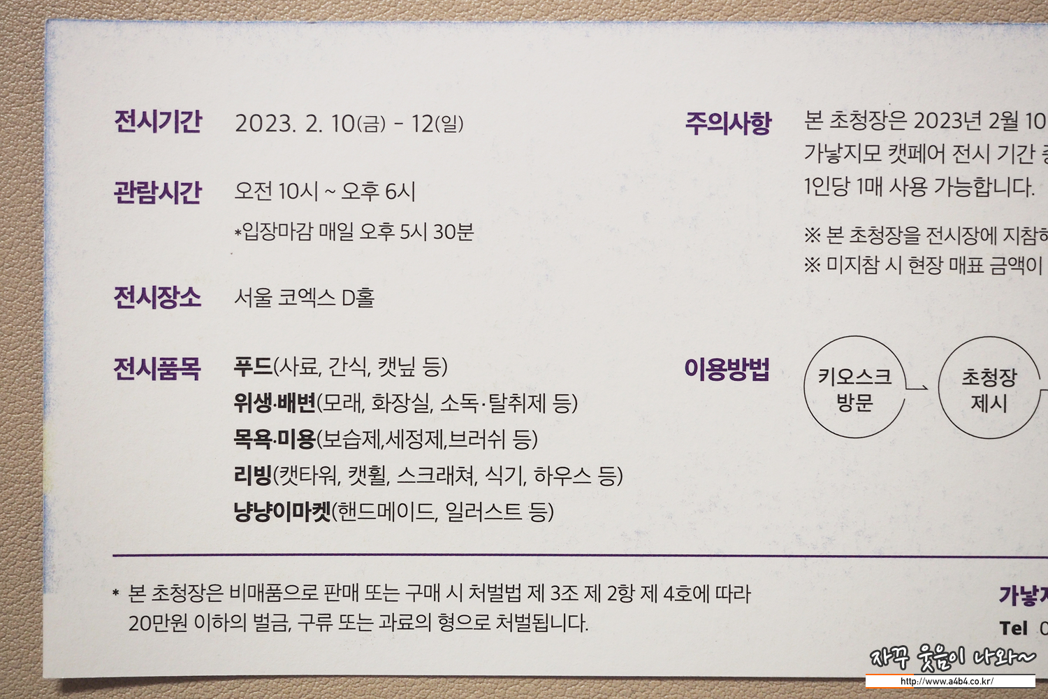 아래 가낳지모 캣페어 공식 홈페이지에서 사전예약 하시면 50% 할인된 5,000원에 예약이 가능합니다만, 동물병원 등에 무료 초대권이 많이 풀려 있다고 합니다.