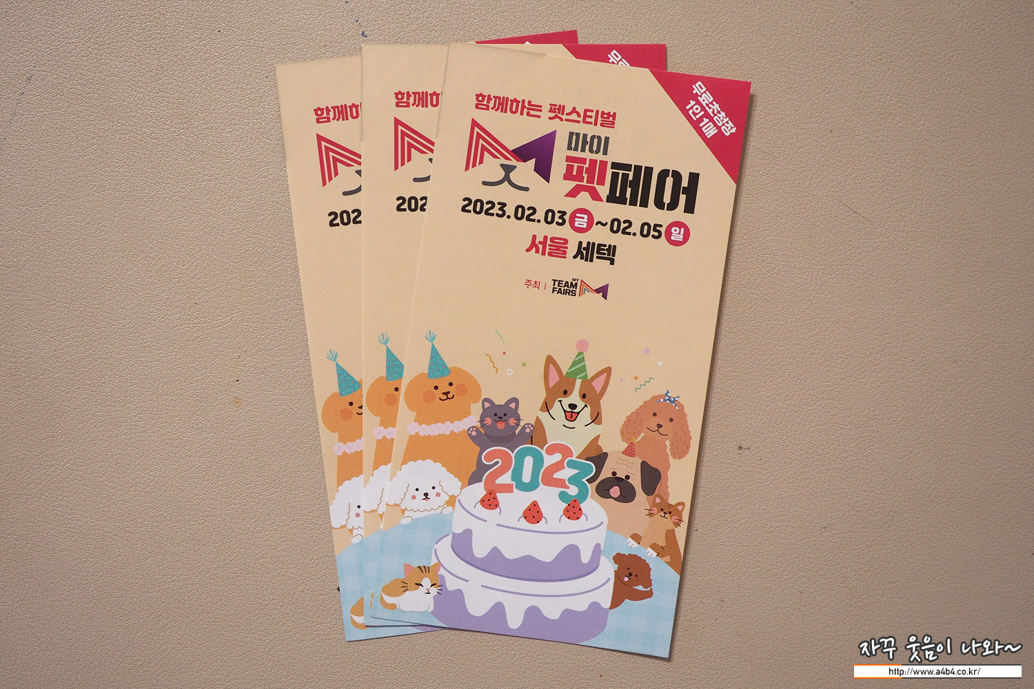 마이펫페어 서울 행사는 공식홈페이지를 통해 사전등록 시 무료입장이 가능하여, 단골 동물병원에도 초대권이 비치되어 있네요. 현장등록 시 성인 : 5,000원, 학생(중/고등) : 3,000원 이네요. 돈 쓰러 가는데, 입장료까지 내고 들어가기는 좀 그렇죠? 마이펫페어 사전등록 바로 하세요.