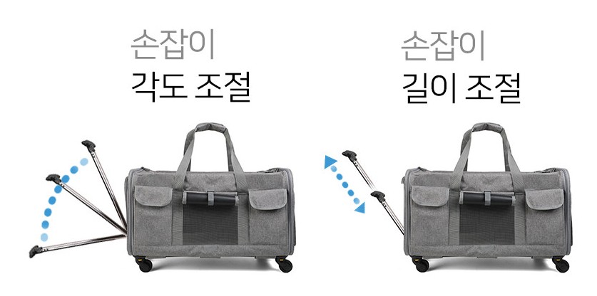 트윙클펫 강이지 켄넬은 여행용 캐리어와 비슷하게 끌고갈 수 있는 2단 손잡이 기능이 있습니다. 2단 길이조절이 가능하고 손잡이 각도 조절이 가능합니다. 90도 까지 각도가 나오지는 않지만 이동에는 큰 어려움이 없습니다. 제가 타사 강아지 켄넬과 고민하다가 선택한 이유 중 하나인 기능입니다.