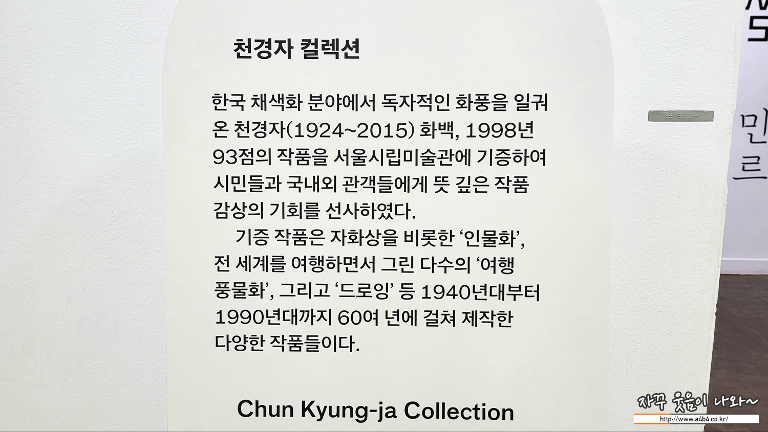 1998년, 한국 화단의 대표적인 작가 천경자(千鏡子, 1924-2015) 화백은 시민과 후학들이 자신의 작품을 쉽게 접할 수 있도록 하기 위해 1940년대부터 1990년대까지 60여년에 걸쳐 제작한 작품 93점을 서울시립미술관에 기증하였는데요. 이중 20여점의 작품이 전시되고 있습니다.