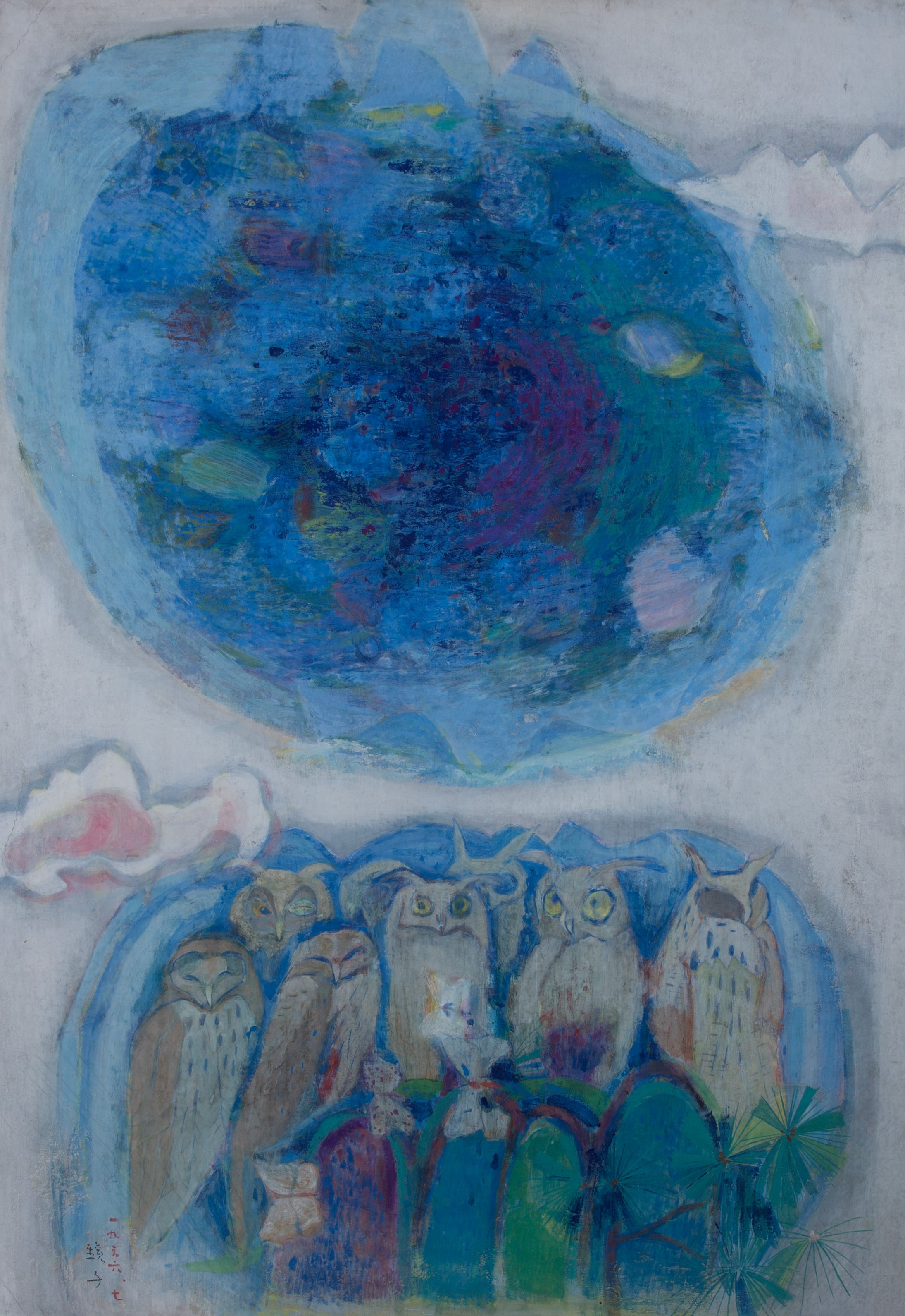 천경자 화백의 작품이라고 하지만 작품의 구도와 색상에서는 김환기 화백의 초기 작품의 느낌이 상당히 난다는... 학이 부엉이로...
