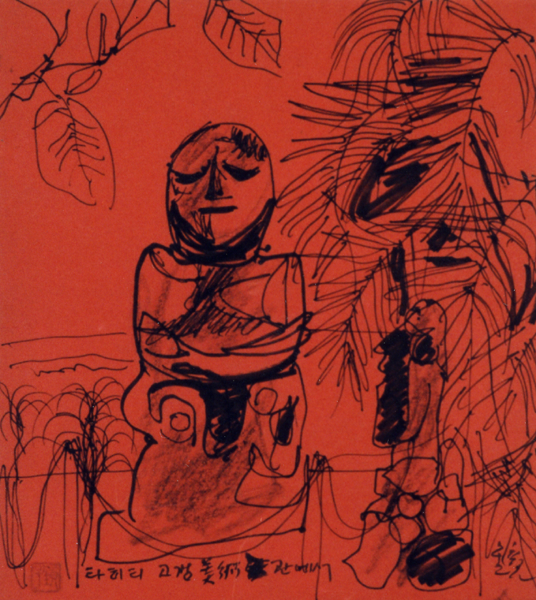 <타히티 고갱 미술관에서>(1969)는 고갱이 살던 집터에 세워진 기념비(석상)를 스케치한 작품이다. 천경자는 폴 고갱의 흔적을 찾기 위해 타히티 여행을 선택했다. 천경자의 기대와 달리 고갱의 집과 미술관에는 작품은 없고 인쇄물과 유품만 남아 있었다. 고갱 미술관에 도착했을 때 천경자의 시야에 가장 먼저 포착된 것은 야자수 잎으로 씌워 놓은 석상이었다. 빠르게 펜으로 그려나간 야자수 잎과 석상의 형태는 천경자의 필력을 드러낸다. 굵은 펜과 콩테로 기념비에 음영을 주어 형상의 볼륨감을 강조했다.