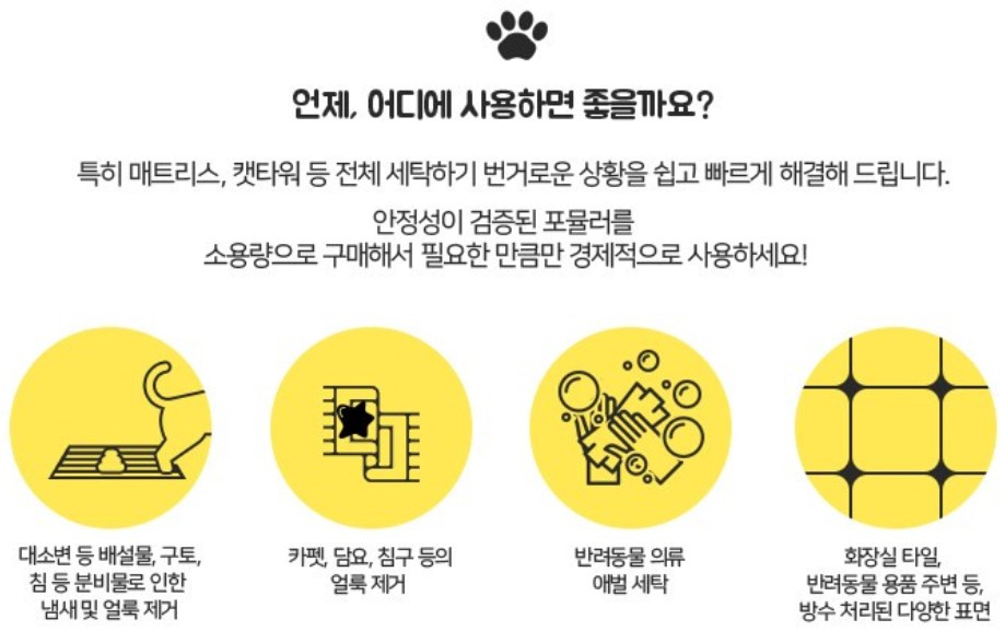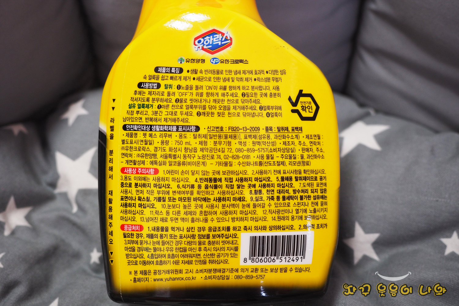 Pet Mess Remover 이라는 이름과 같이 반려동물의 배설물이나 분비물로 인한 냄새와 얼룩을 쉽게 해결하는 제품입니다. 다른 여러 브랜드의 리무버가 있지만 유한 락스 브랜드 제품은 처음입니다.