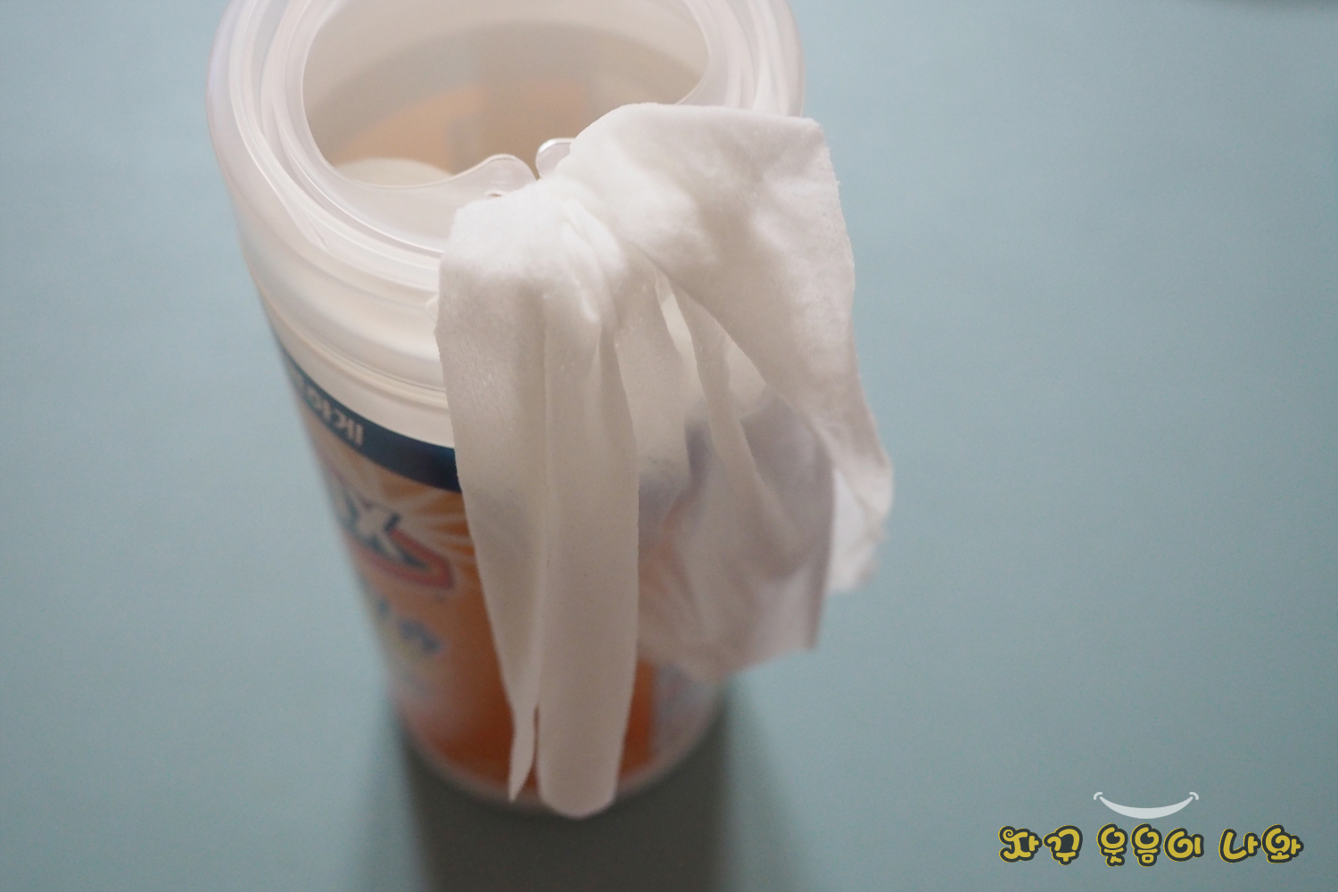 유한크로락스 세정살균티슈는 티슈형으로 뚜겅을 열고 한 매씩 뽑아서 사용이 가능하게 되어 있습니다.
