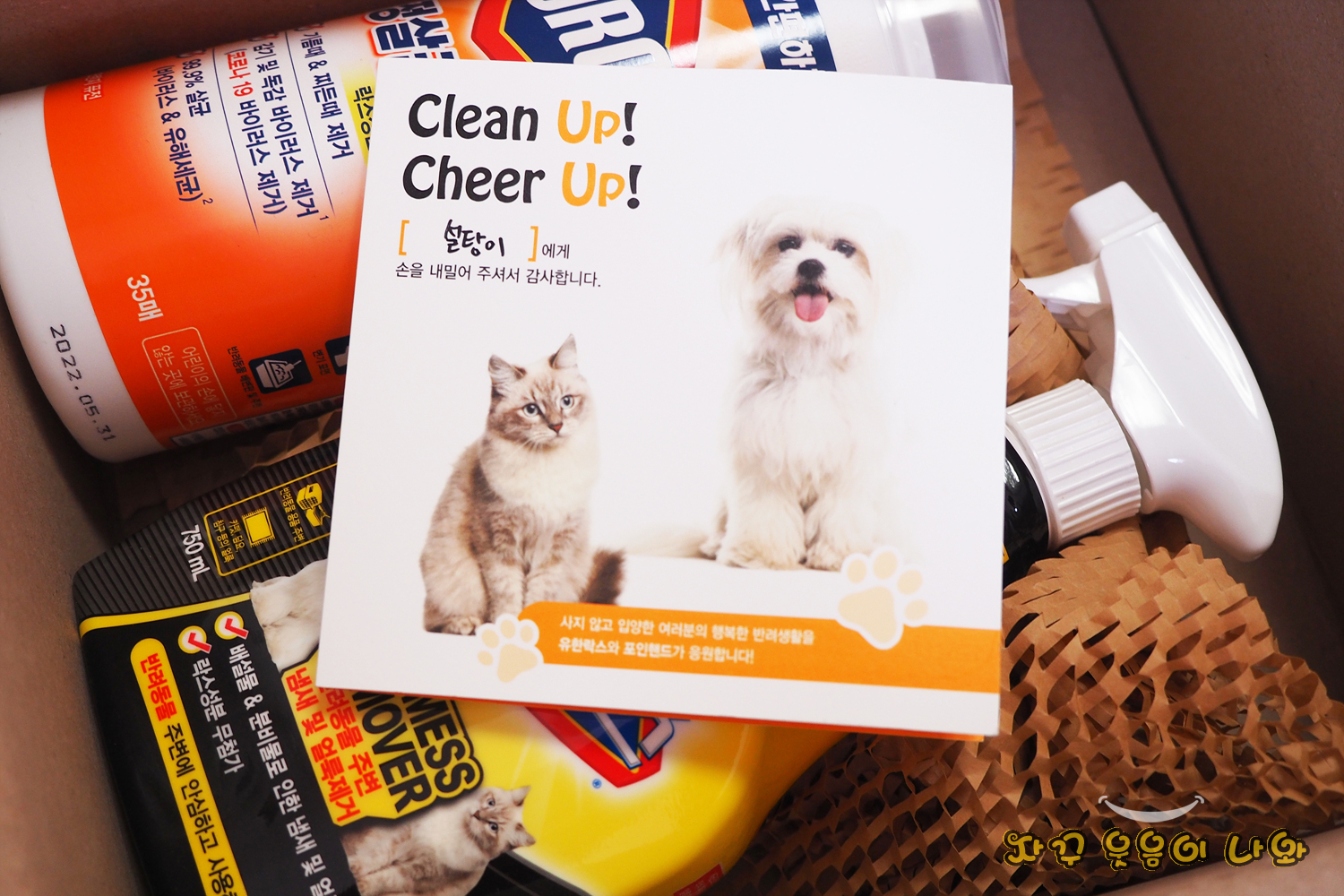 동봉된 제품은 유한 세정살균티슈와 유한약품 '펫 메스 리무버 (Pet Mess Remover)' 두 종 입니다.