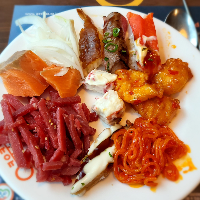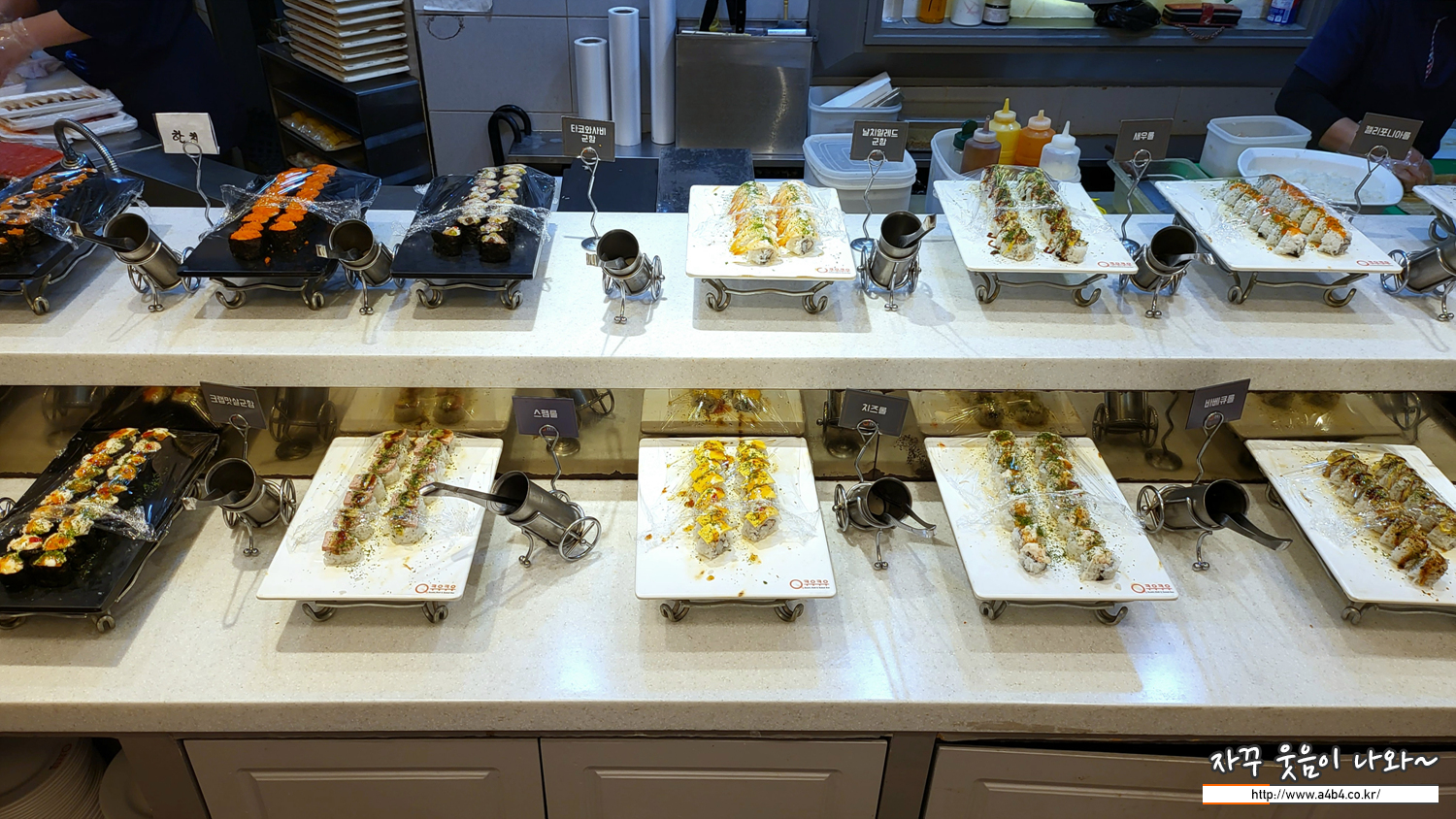 초밥 외에도 롤과 군함도 다양하게 준비되어 있습니다. 초밥은 좋아하지 않는 일행이 있었는데, 그래도 고기 초밥과 롤이 다양하게 준비되어 있어 만족할 수 있었습니다.