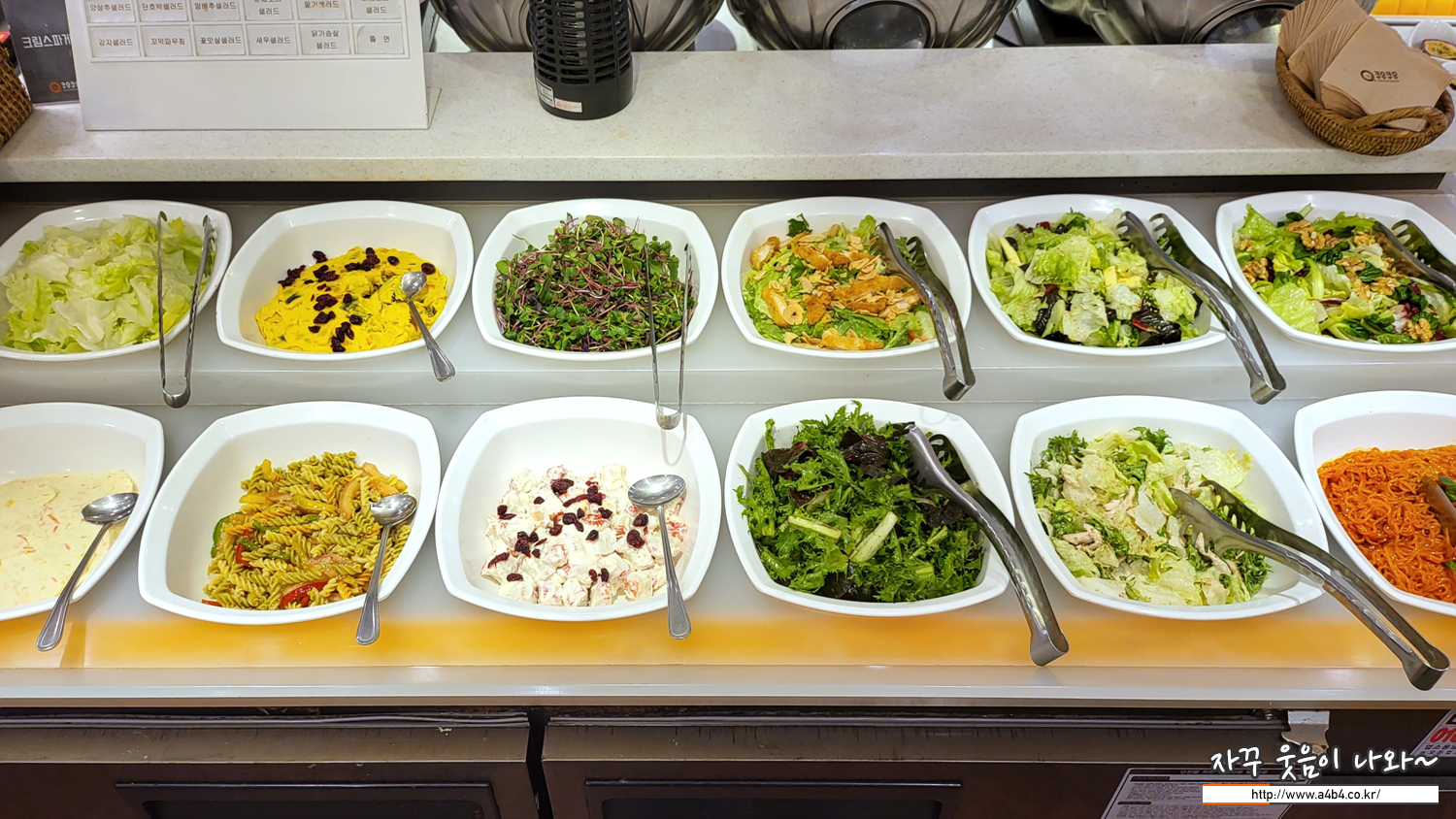 쿠우쿠우 셀러드는 양상추, 레디치오, 비타민, 치커리, 파프리카, 오이, 양파, 토마토카프레제, 닭가슴살샐러드, 연어샐러드, 게살샐러드, 버섯샐러드, 단호박샐러드, 쫄면 등이 준비되어 있습니다.