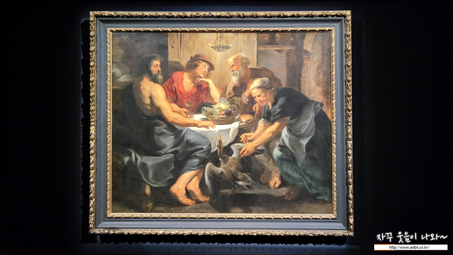 나그네로 변장한 신들은 프리기아라는 마을을 방문한다. 집집마다 문전박대를 당하지만 유일하게 이 늙은 부부만이 그들을 성심성의껏 대접했다. 화가는 노인이 손님에게 대접한 포도주가 줄어들지 않아 이들의 정체를 깨닫는 순간을 그렸다. 붉은 옷을 입은 머큐리를 마주보는 필레몬은 가슴에 손을 올리고 있고, 주피터는 손을 들어 단 한 마리 남은 거위마저 잡으려는 바우키스를 저지하고 있다. 루벤스는 안트베르펜에서 공방을 열고 장르별 대표 화가들과 협업했는데, 이 작품의 정물과 동물은 플랑드르 화가 프란스 스네이데르스가 그렸다.