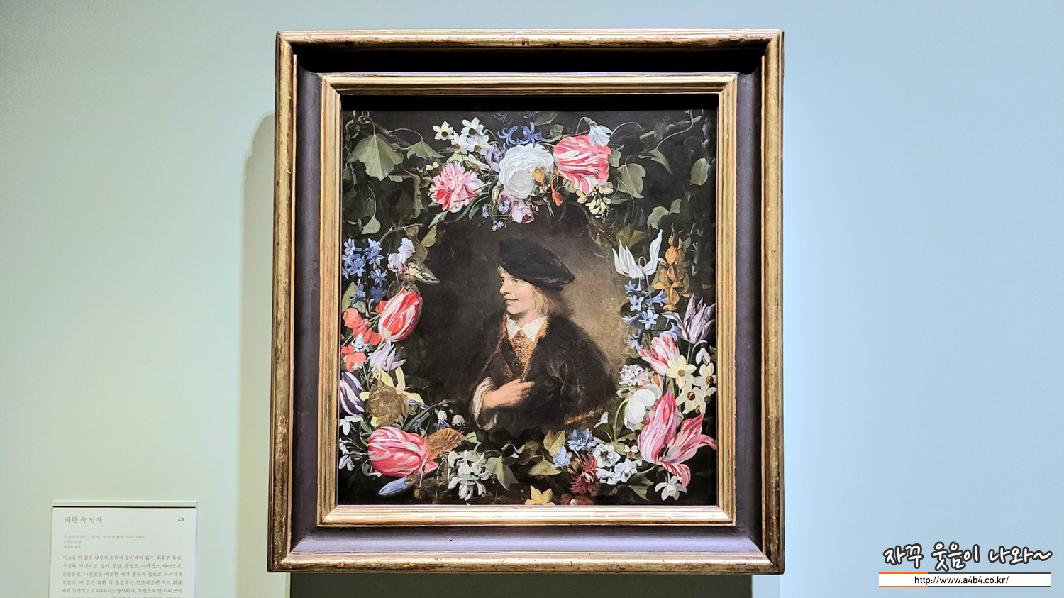 미소를 띤 젊은 남성이 화환에 둘러싸여 있다. 화환은 튤립, 수선화, 카네이션, 장미, 한련, 물망초, 히아신스, 아네모네, 은방울꽃, 나팔꽃을 비롯한 여러 종류의 꽃으로 화려하게 꾸몄다. 이 같은 화환 속 초상화는 안트베르펜 지역 회화 에서 일반적으로 나타나는 양식이다. 루벤스와 반 다이크의 영향을 받은 얀 리벤스는 초상화로 가장 잘 알려진 네덜란드 화가였다.