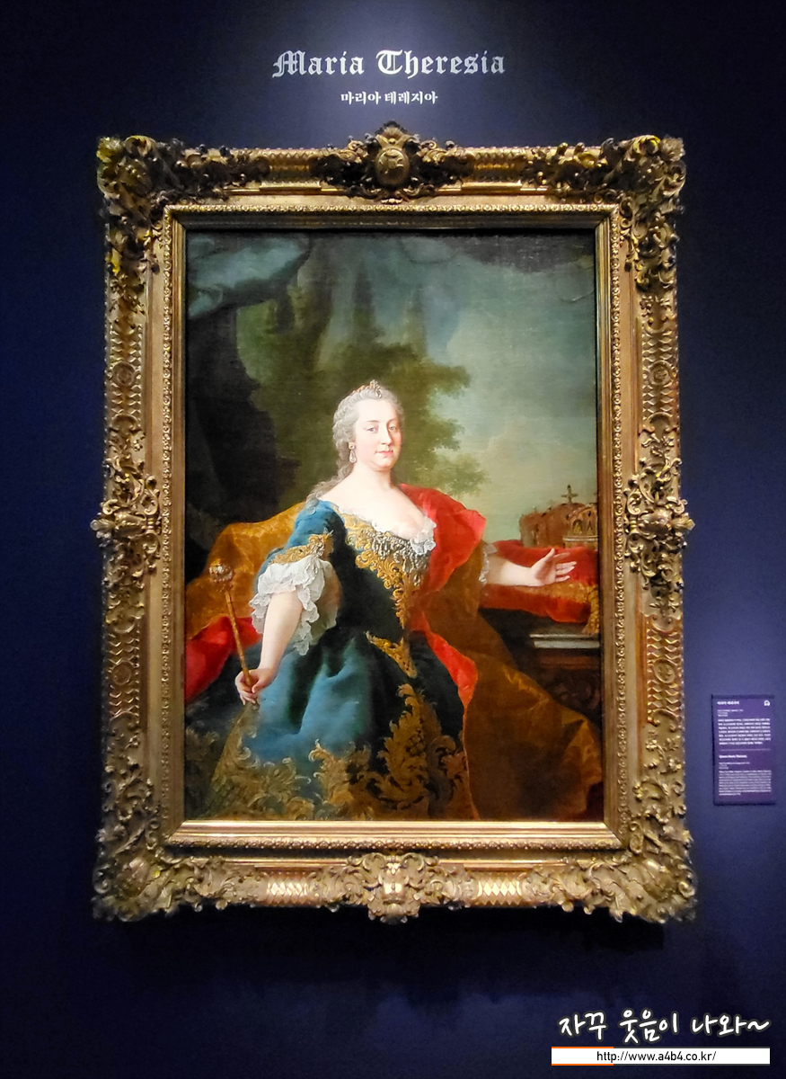 마리아 테레지아는 1740년 아버지 카를 6세가 사망하자 오스트리아와 헝가리, 보헤미아의 왕위를 차례대로 계승한다. 세 군주국의 위엄은 탁자 위에 올려둔 왕관으로 드러난다. 헝가리의 성 슈테판 왕관, 보헤미아의 성 바츨라프 왕관, 오스트리아의 대공관이 차례로 놓여 있다. 여성은 신성로마제국 황제가 될 수 없었기 때문에 남편인 프란츠 슈테판이 1745년 신성로마제국 황제로 즉위했다.
