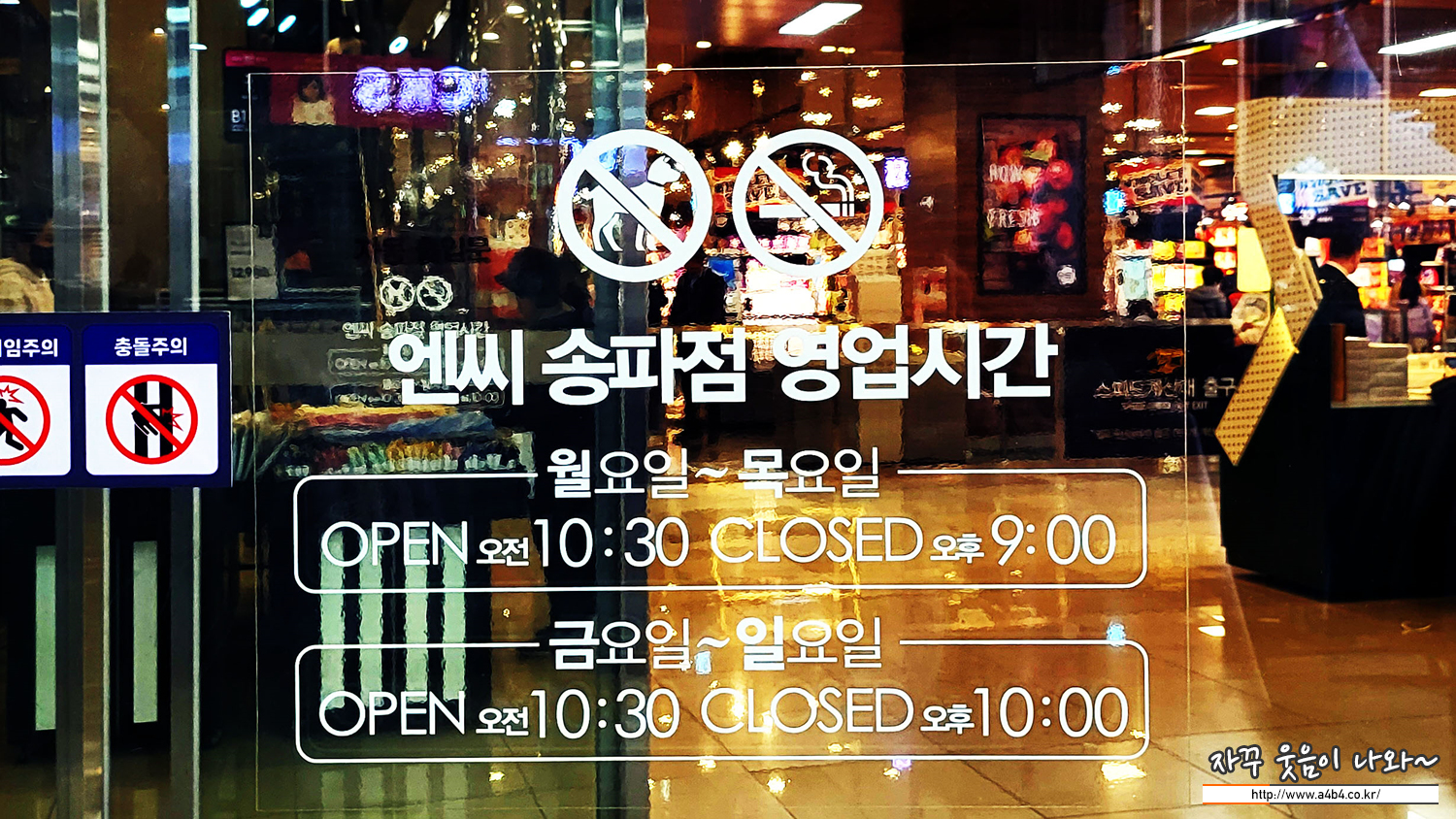 NC백화점 송파점은 강아지 동반이 불가능합니다. 입구에 표시된 반려견 입장 불가 안내. 건너편 현대시티몰과는 상반된 정책입니다. 엔씨 송파점 영업시간은 아래 이미지 참고하세요. 현대아울렛 보다는 30분 늦게까지 영업하네요.