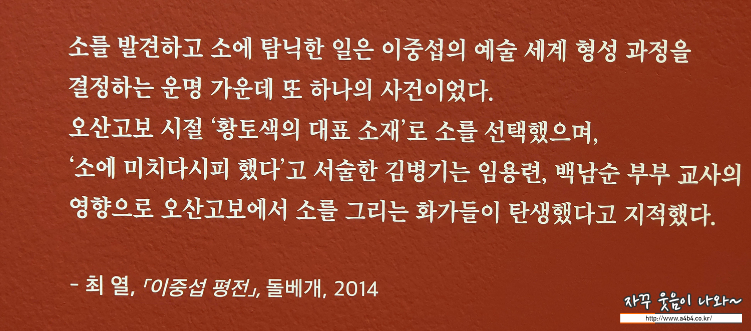 이중섭은 역경 속에서도 묵묵히 제 갈 길을 가는 소를 일제 치하 우리 민족의 강인한 정신력을 상징하는 동물로 여겼습니다. 또한 격동의 근현대를 살아가는 이중섭의 자신의 삶을 상징하기도 합니다.일본으로 떠나보낸 아내에게 보낸 편지에서 이중섭은 "나는 '한국'이 낳은 정직한 화공"이라 말했습니다. 한국이 낳은 화공으로서, 한국인의 상징인 소를 자신의 자화상으로 삼은 것입니다