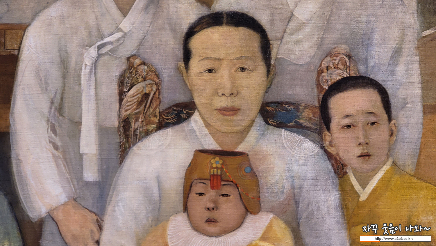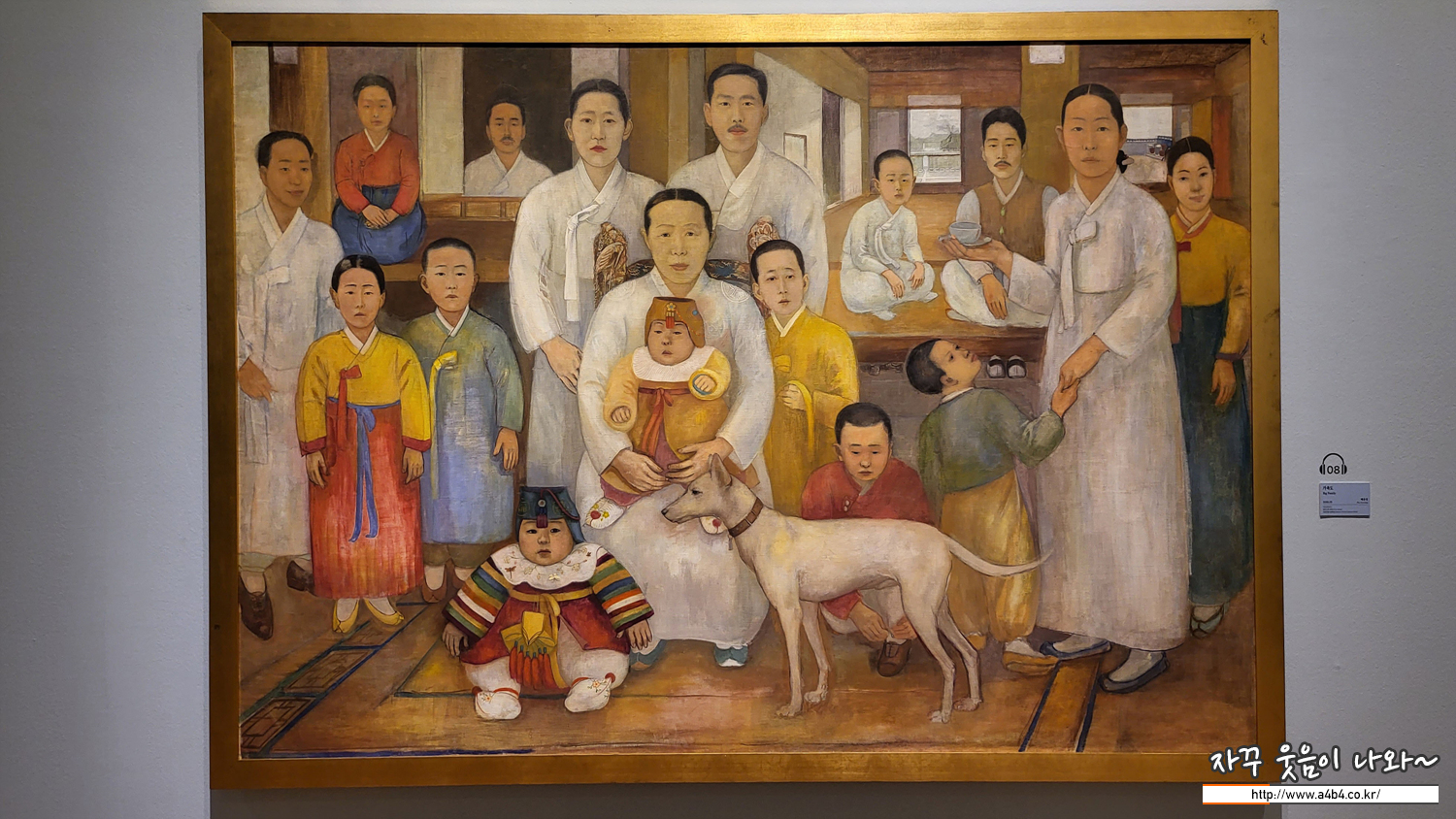 한옥을 배경으로 마당에 열일곱 명의 대가족이 늘어서 있습니다. 화가 배운성이 자신의 후원자였던 백인기 가족을 회상하며 그린 것으로 추측됩니다. 화면 중앙에 아이를 안고 있는 노모를 중심으로 3~4대에 걸친 가족 구성원을 배치했습니다. 그림엔 화가 자신도 그려 넣었습니다. 가장 왼쪽 흰색 두루마기를 입은 사람이 바로 배운성입니다. 구두를 신은 인물, 애완견 등 서양 문물의 유입으로 변화된 근대의 생활상을 볼 수 있습니다. 이 작품은 1935년 독일 함부르크 민속박물관 개인전에 출품됐던 그림입니다. 당시 생활상을 보여주는 사료적인 가치를 인정받아 2013년 국가등록문화재로 지정되기도 했습니다.