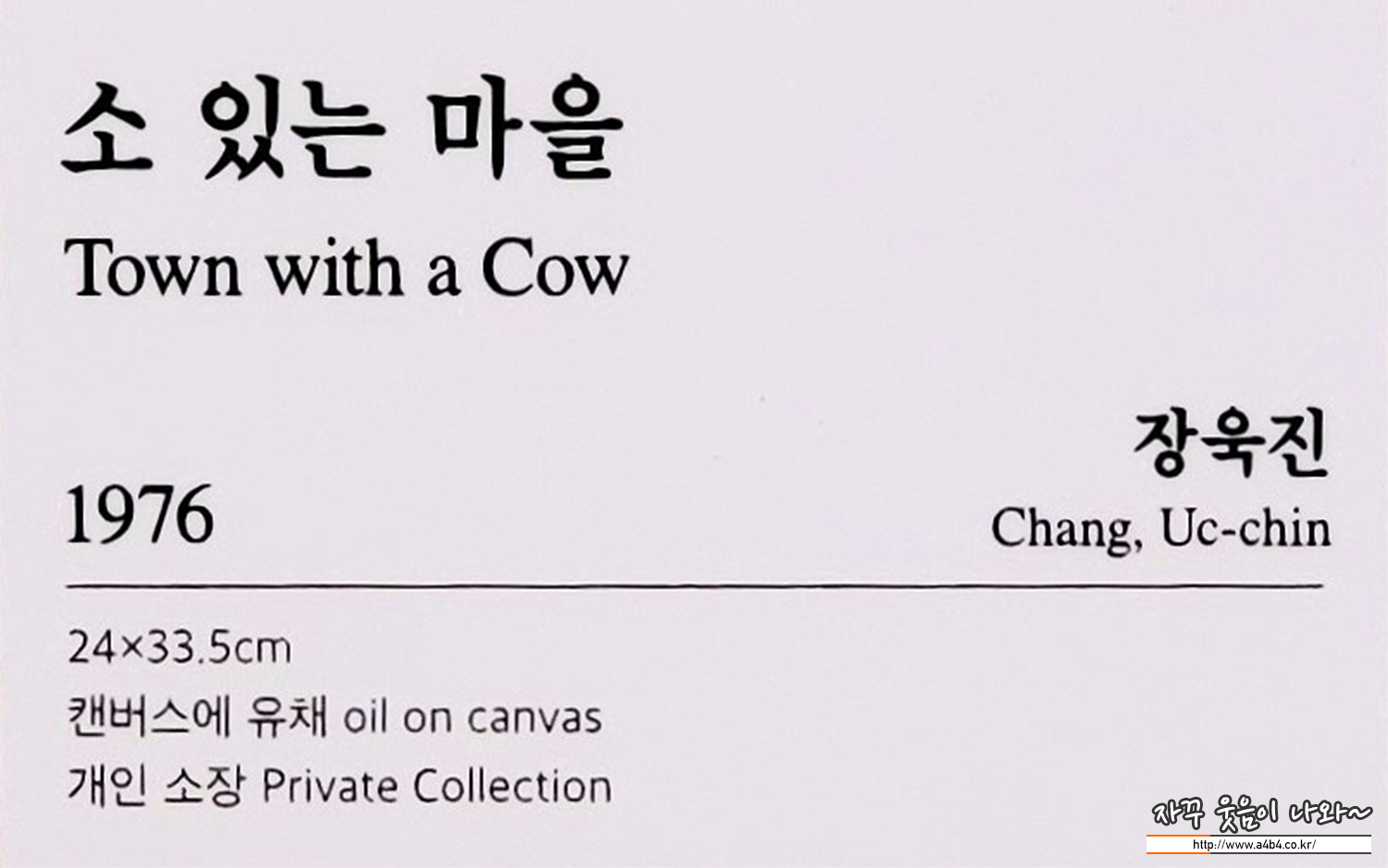 그림 중앙에 소가 있고, 하늘에는 새 두 마리가 다른 방향을 향해 날아 갑니다. 나무 두 그루와 그 옆에 서 있는 사람이 좌우 대칭구도를 이룹니다. 단조로운 화면 구성을 깨뜨리기 위해 소 옆에 깨알처럼 아이와 개를 넣어 작가 특유의 유머를 담았습니다. 어린 아이가 그린 것처럼 천진난만한 화풍이 인상적인 장욱진의 작품입니다. 나무, 아이, 집, 새, 마을.. 장욱진의 그림에 등장하는 단골 소재가 한 화면에 소박한 색채,간결한 형태로 담겼습니다. '작은 그림' 예찬론자인 장욱진답게 이 그림 역시 작고 단순합니다. 장욱진은 "그림이 커지면 싱거워진다. 작은 그림은 친절하고 치밀하다"면서 어린이의 마음으로 세상을 바라봤습니다.