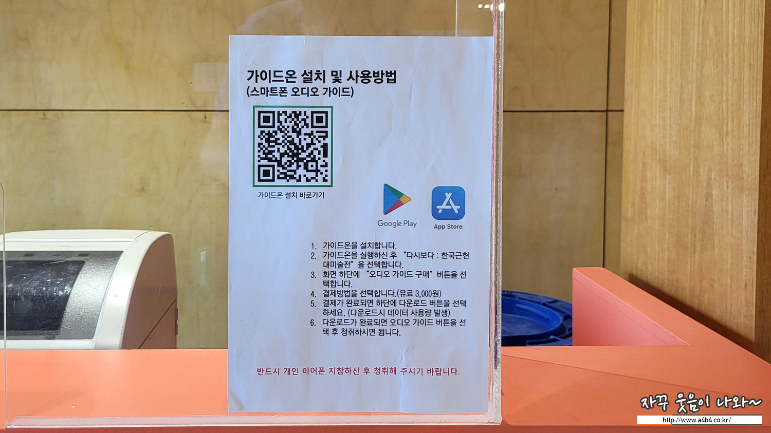 다만 가이드온을 통해 3천원에 오디오 가이드 이용이 가능합니다. 별도의 기기 지원은 없으며 스마트폰에 애플리케이션을 다운로드 받아 이용해야 합니다. 스마트폰 배터리 완충과 이어폰도 소지하시고 방문 하세요.