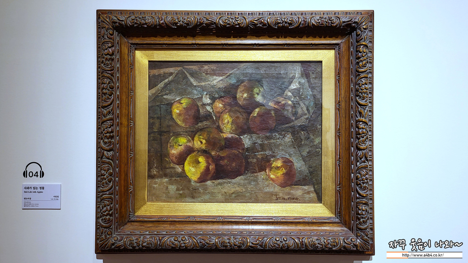 조선의 고갱'이라 불리는 천재화가 이인성이 즐겨 그린 소재가 있습니다. 바로 자신의 고향 대구의 지역 특산물인 사과입니다. 이인성이 화가의 꿈을 키우며 살던 대구 산격동엔 '이인성 사과나무길'이 있을 정도입니다. 이 작품은 이인성의 각별한 사과 사랑과 함께 탁월한 색감과 조형 감각을 보여주는 정물화입니다. 자연스러운 화면 구성, 붉은 색과 녹색의 대비가 인상적인 작품입니다.정확한 제작 연도는 알 수 없으나 서명으로 연대를 추정할 수 있습니다. 이인성은 시기에 따라 다른 서명을 썼는데, 이 작품에서 보이는 영어 대문자 서명은 1940년대 이후 작품에서 주로 보입니다. 이인성은 1950년 경찰관 총기 오발 사고로 38세의 나이에 황망하게 세상을 떴습니다.
