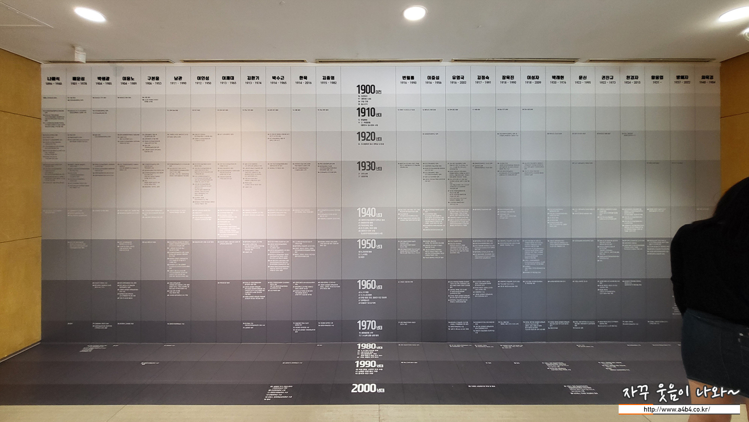 다시 보다 : 한국근현대미술展 2전시실과 3 전시실로 이동하는 공간에 미디어월과 이번 전시회 작가들의 연표