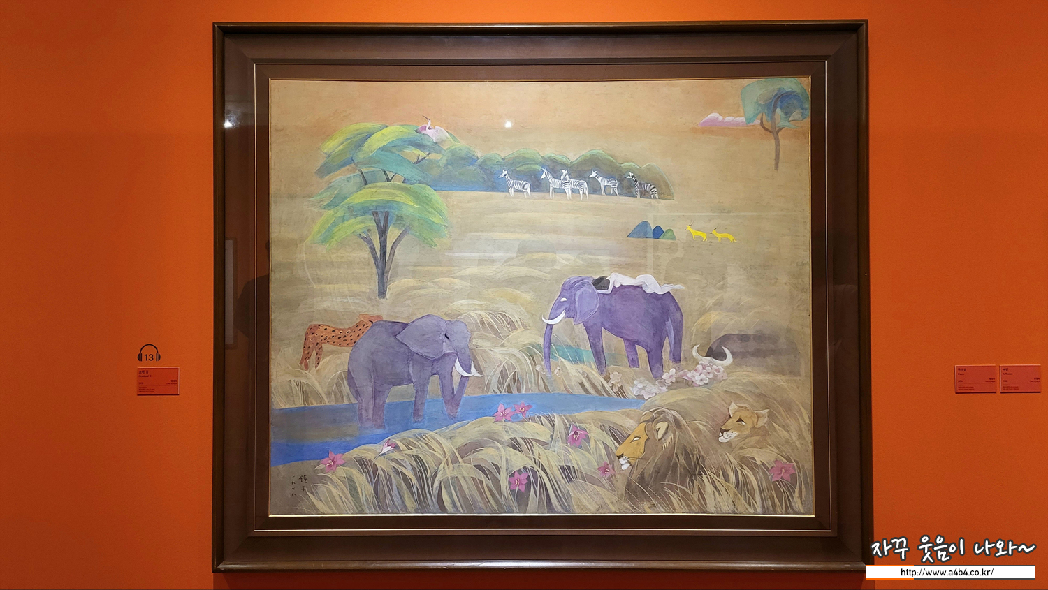 초원 2'는 개성 넘치는 현대적 채색화로 한국근현대미술사에 큰 족적을 남긴 천경자의 작품입니다. 1970년 대 중반 작가는 아프리카 여행을 하면서 그곳의 원시적 자연에 크게 자극을 받고 다양한 그림을 남겼습니다.
